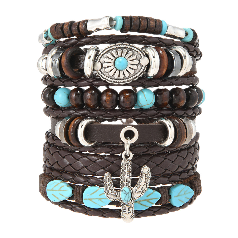 欧美跨境新款多层仙人掌松石6件套手工编织皮手链 多件套皮手链