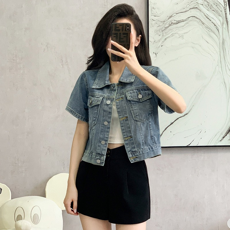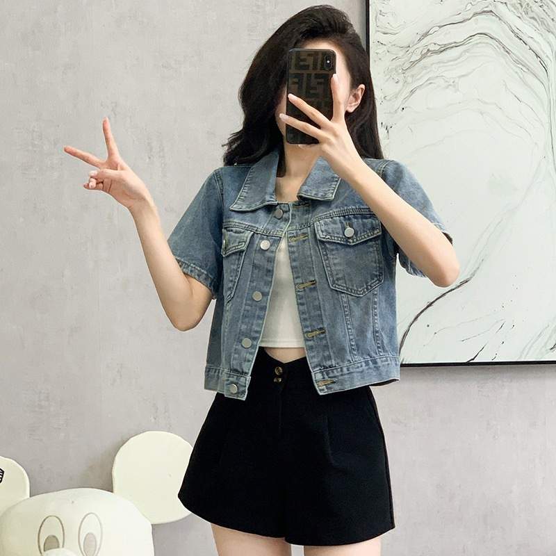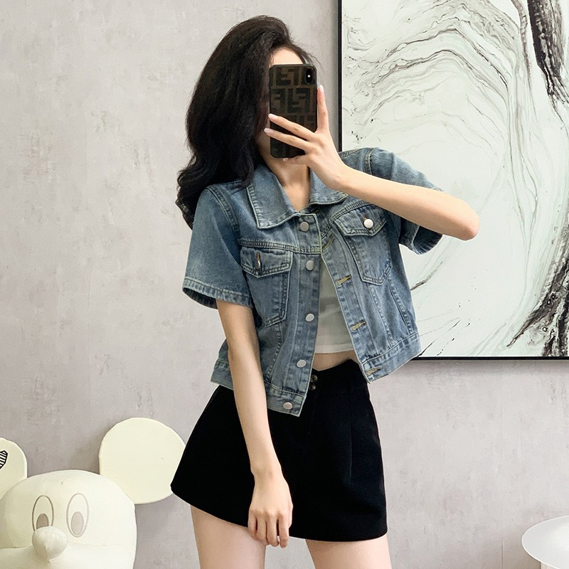 港味复古牛仔短袖衬衫女2025夏季宽松显瘦PoIo领短款开衫上衣外套