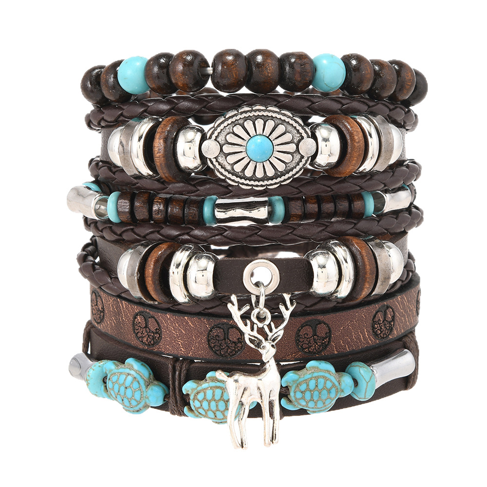 TEMU跨境新品欧美复古皮革编织手工串珠木珠松石6件套皮手链套装