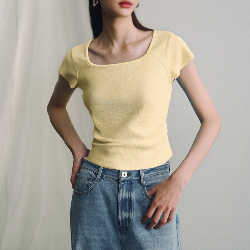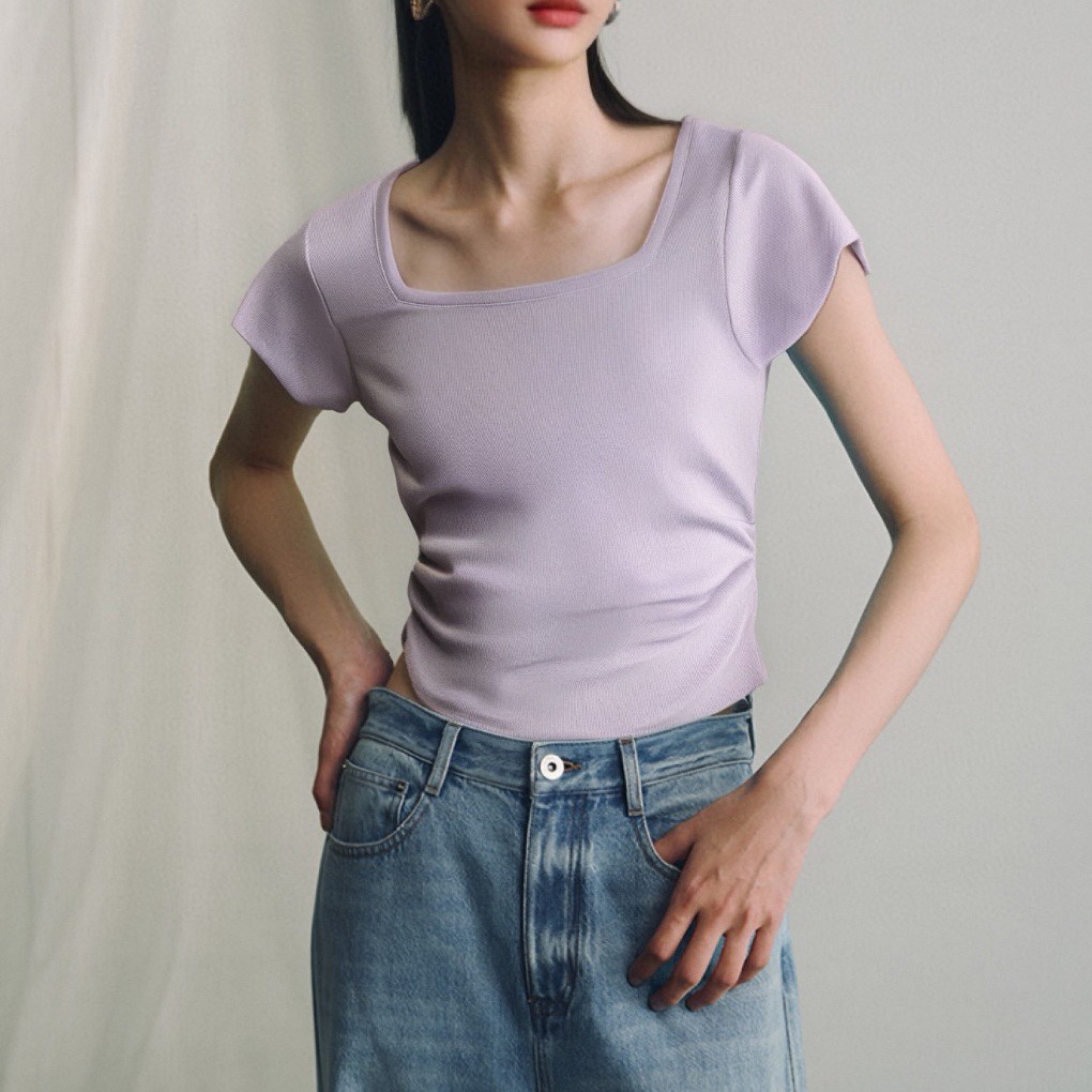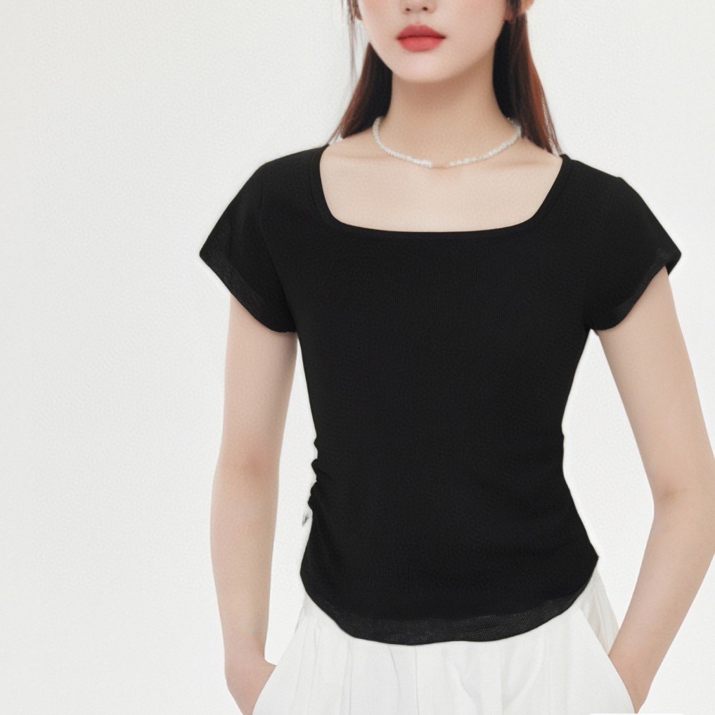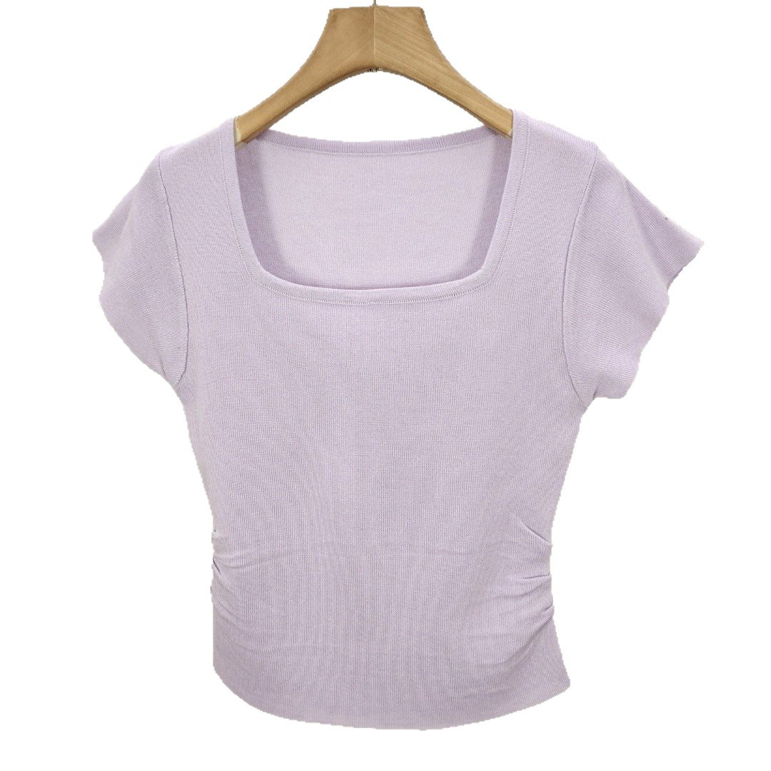 美式复古褶皱方领正肩冰丝短袖t恤 新款修身设计感针织衫女夏薄款