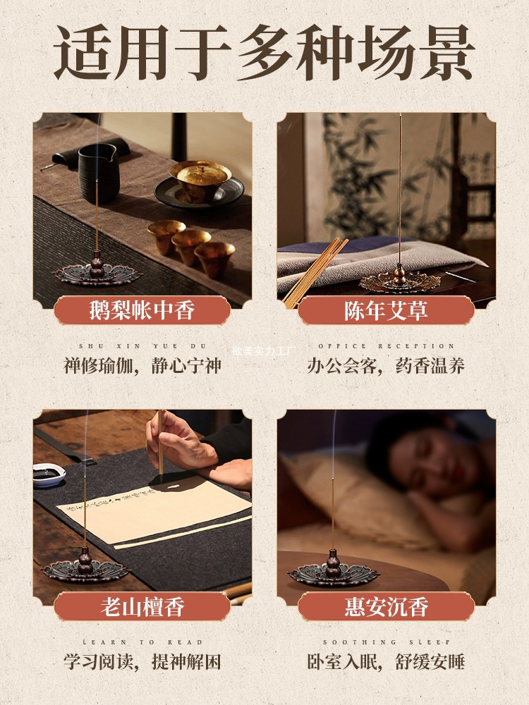规格 | 纯正香味天然选材【送香盘香插】-灵动桂花香+清新栀子花【送莲花香盘香插一套】 | | 规格 | 纯正香味天然选材【送香盘香插】-百年老檀香约450支-阅读办公【送莲花香盘香插】 |