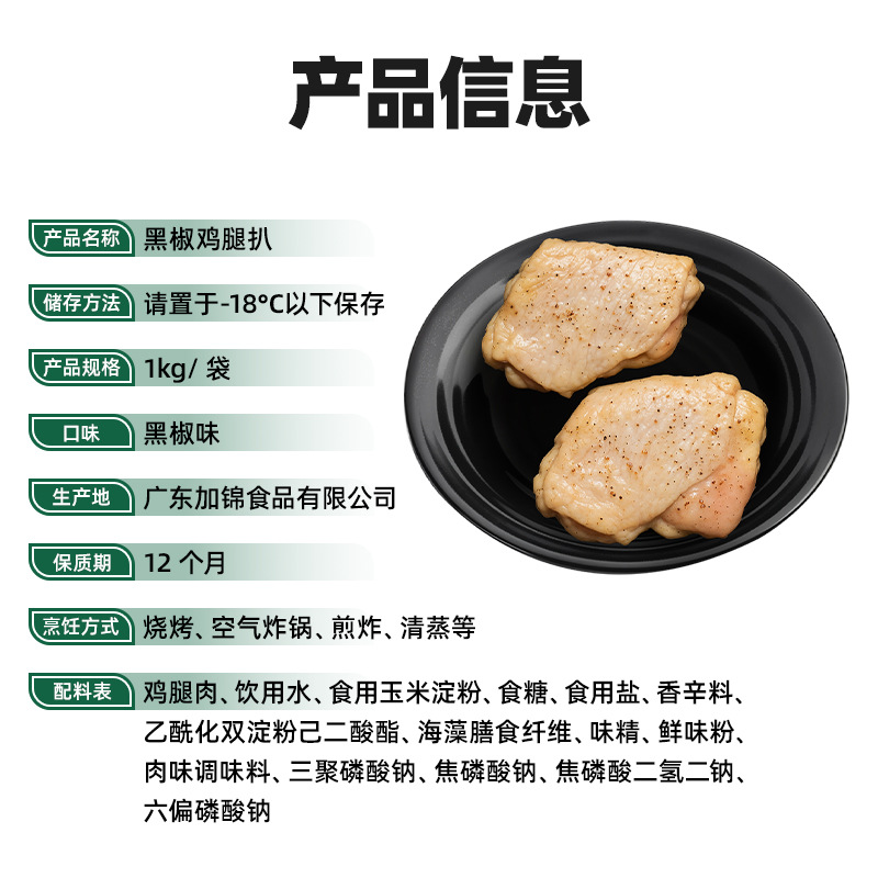 鸡腿肉、饮用水、食用玉米淀粉、食糖、食用盐、香辛料、海藻膳食纤维、味精、鲜味粉、肉味调味料、乙酰化双