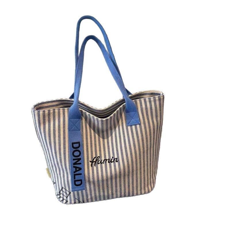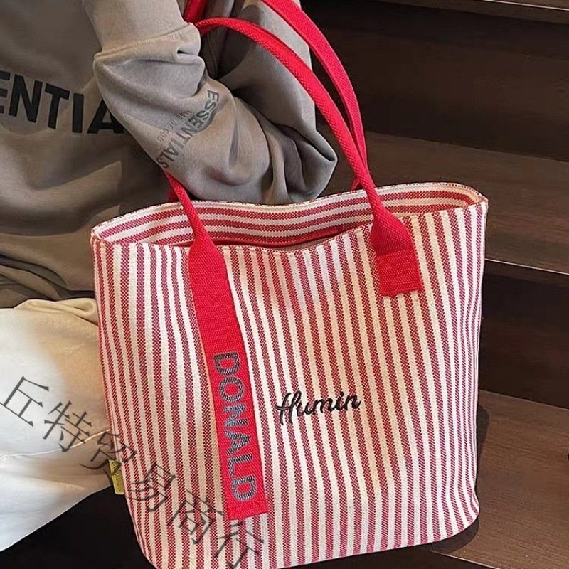 夏季条纹帆布包包女2025新款大容量上课手提袋韩系单肩通勤托特包