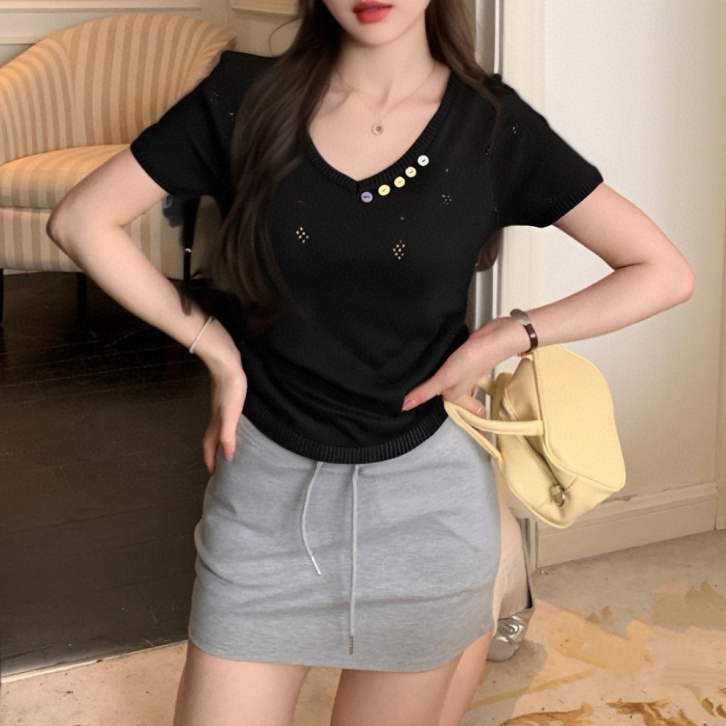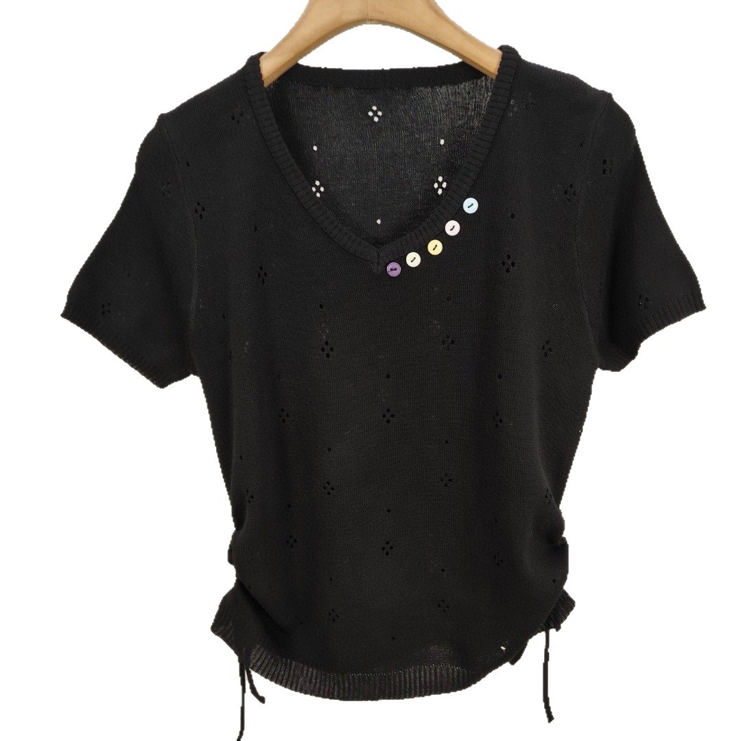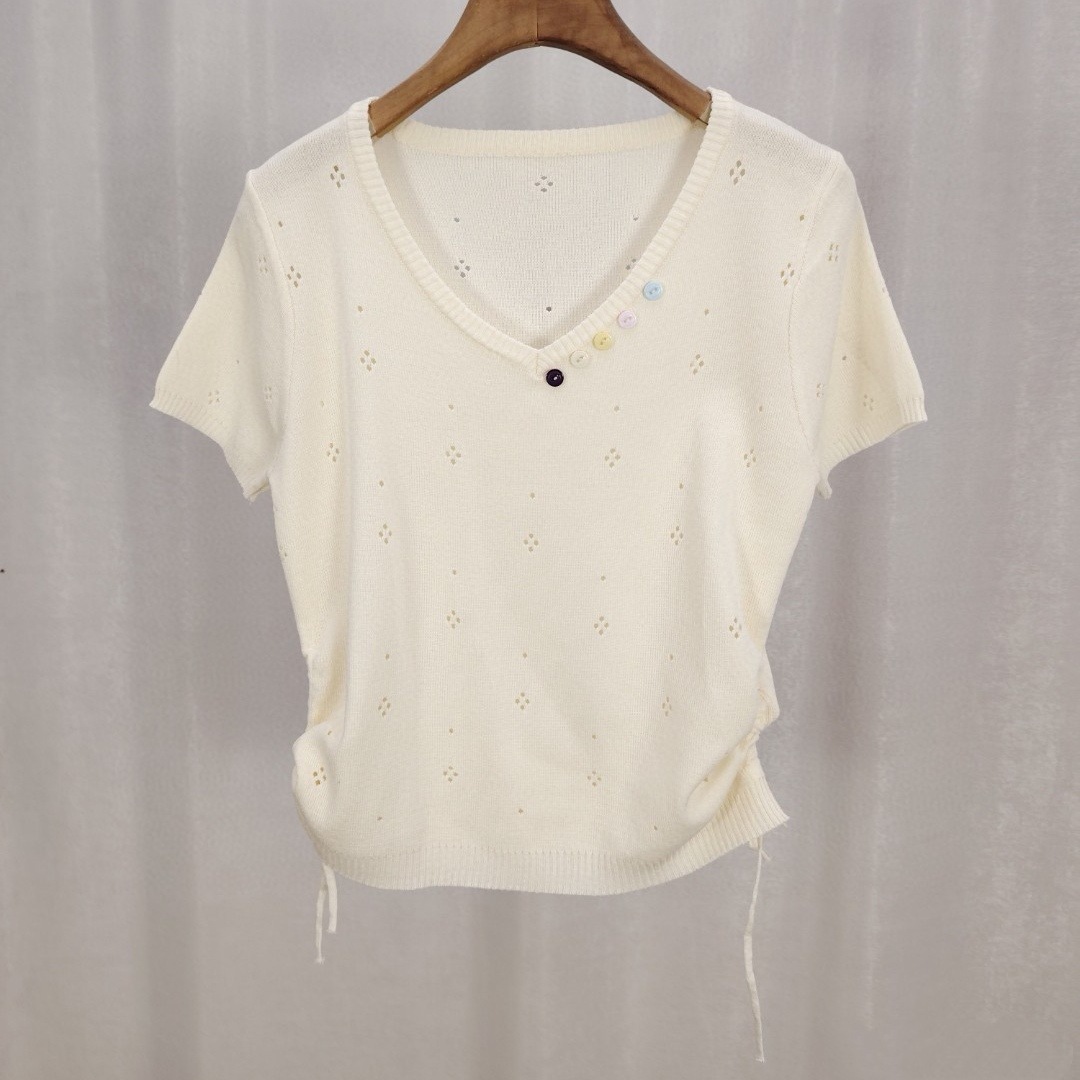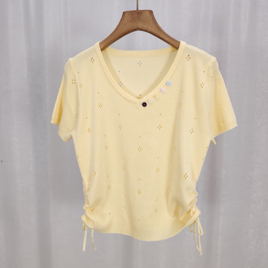 2025新品韩系纽扣V领针织短袖T恤女夏新款小个子洋气镂空冰丝上衣