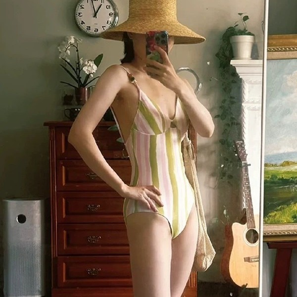 新款条纹撞边连体泳衣女Frida系列法式甜美度假约会海边穿搭夏季