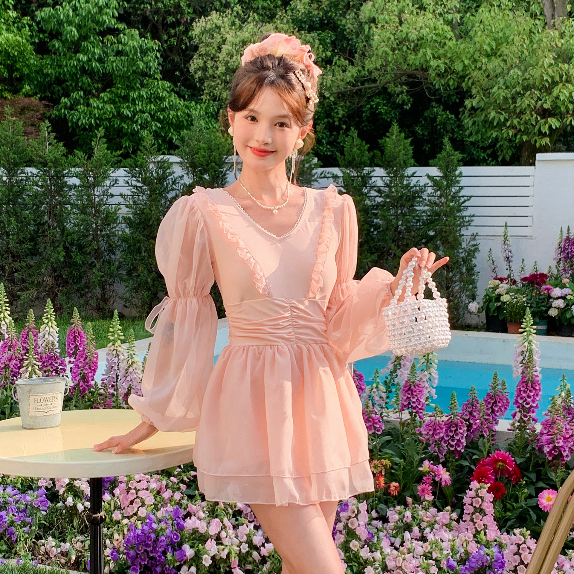 新款连体母女裙式保守舒适游泳衣女显瘦遮肚女宝宝纯色泡温泉泳装