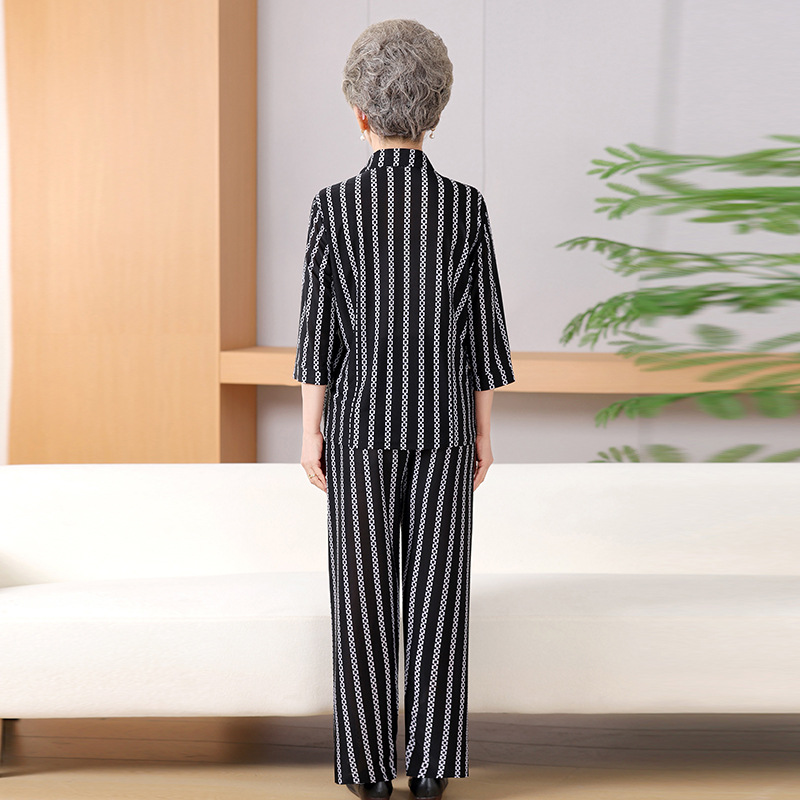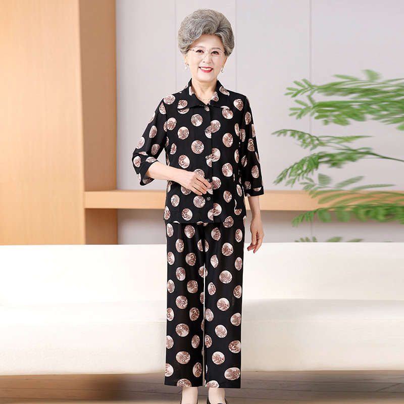 奶奶夏季冰丝套装老年人女装开衫翻领衬衫弹力七分袖老太太两件套