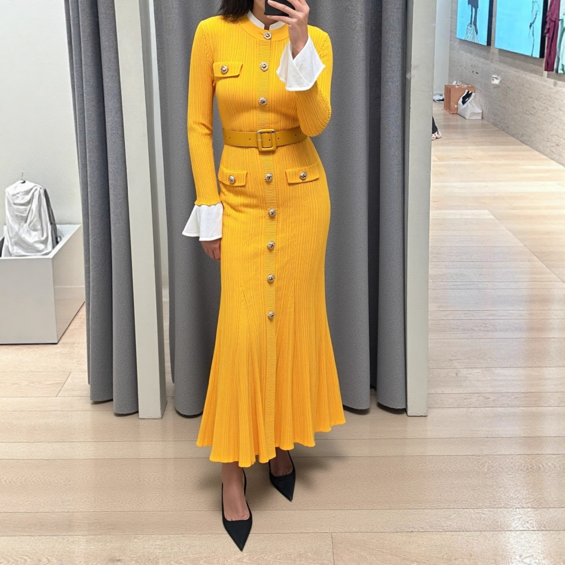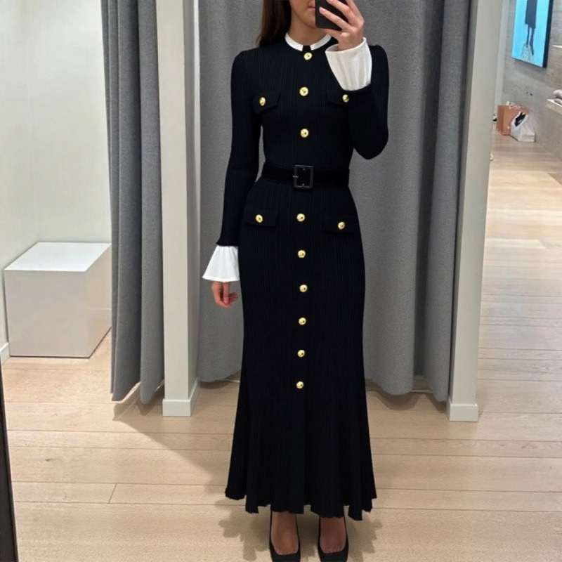 | 适用场景 | 城市通勤 | 2 | 深圳南油跨境新款长袖针织连衣裙实拍现货优雅气质黑色长袖圆领单排扣连衣裙弹力针织毛衣裙子 |