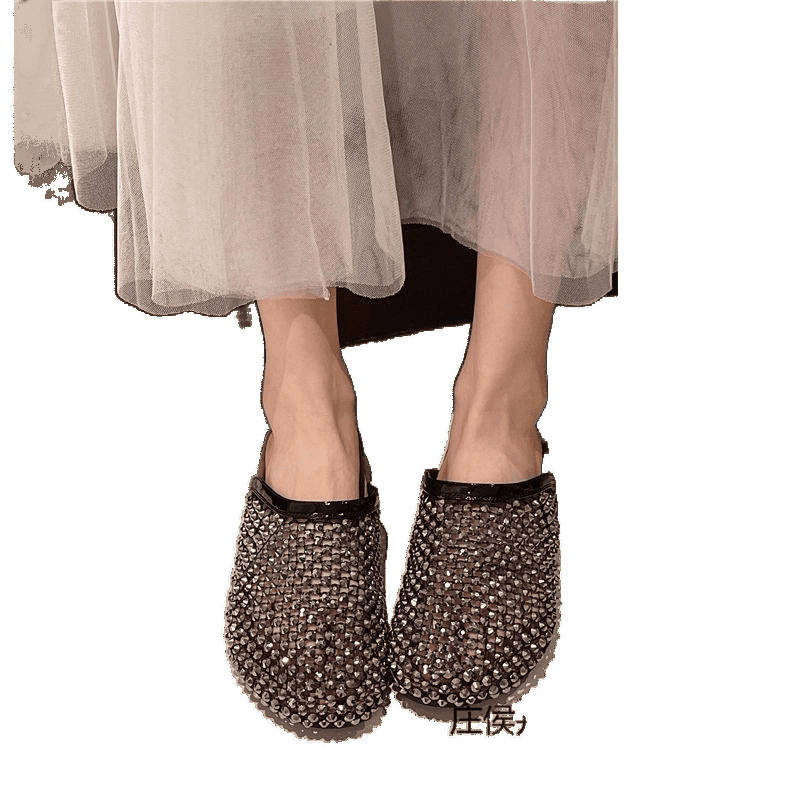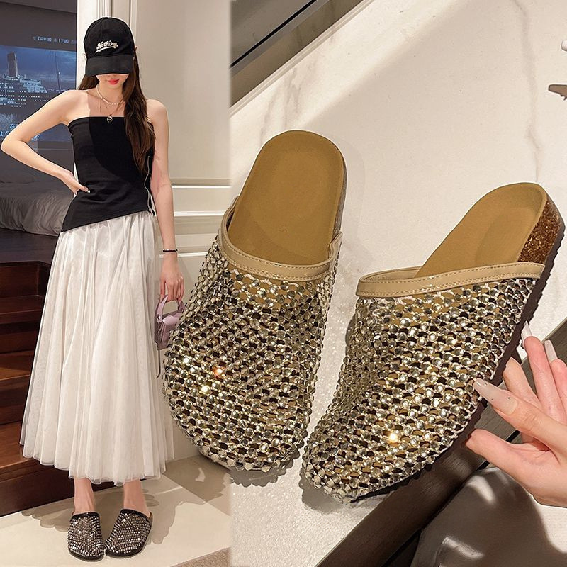 小众真皮度假风水钻半拖女欧洲站网面编织包头拖外穿沙滩鞋潮