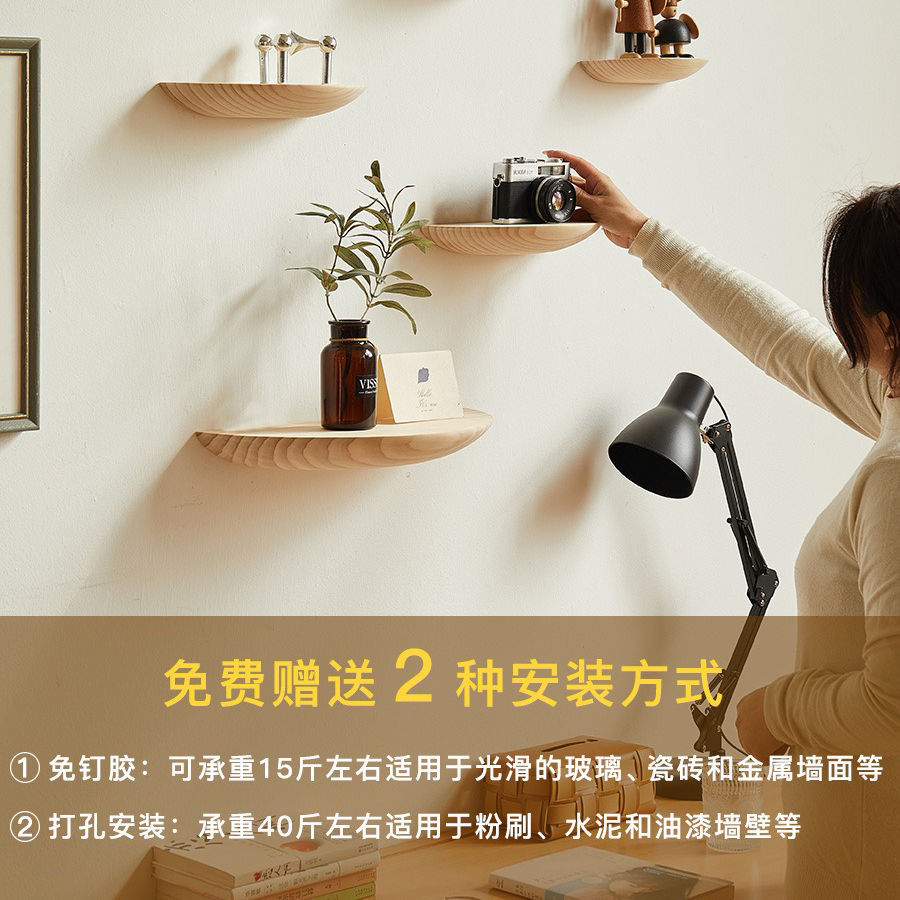 免打孔半圆实木隔板墙上置物架装饰北欧壁挂式客厅电视墙网红家居