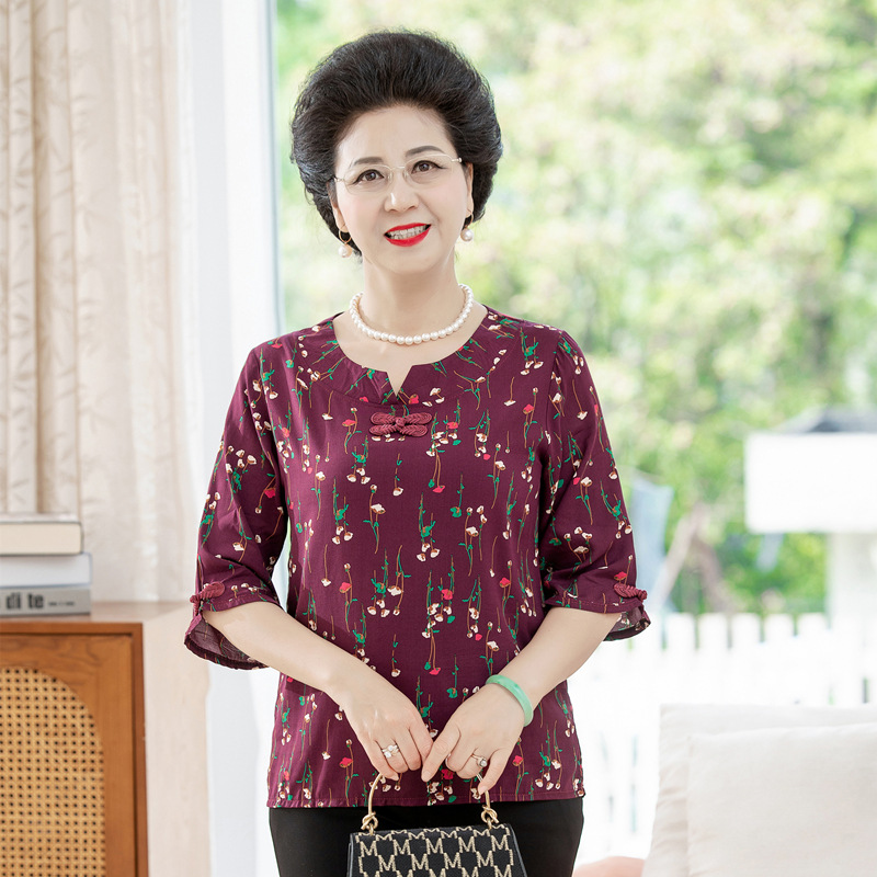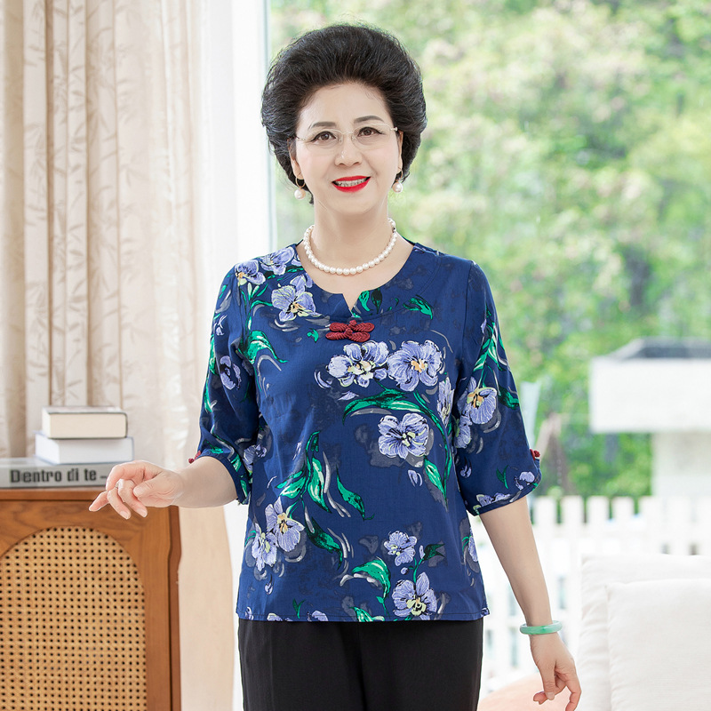 中老年女妈妈棉绸夏装中袖唐装T恤老太太人造棉薄款奶奶绵绸上衣