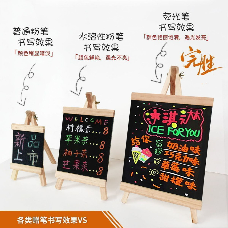 | 尺寸 | 黑板+支架(送粉笔+套+板擦+布) | 尺寸 | 3支水性荧光笔+(原套餐) |