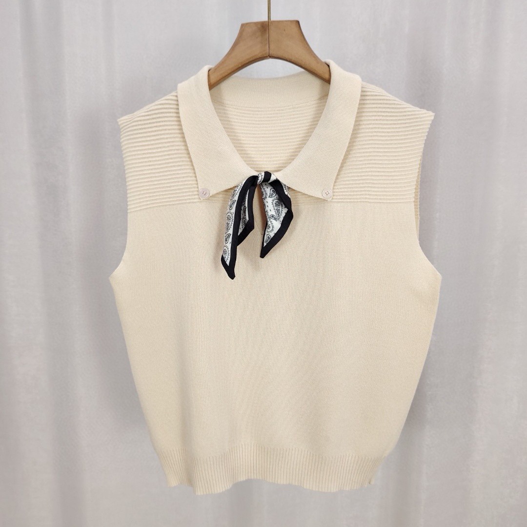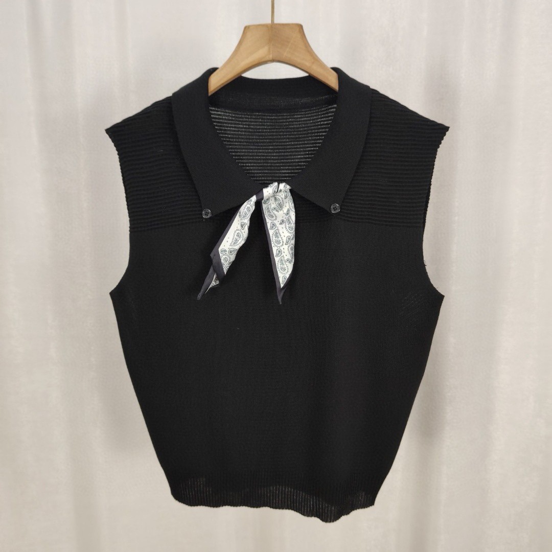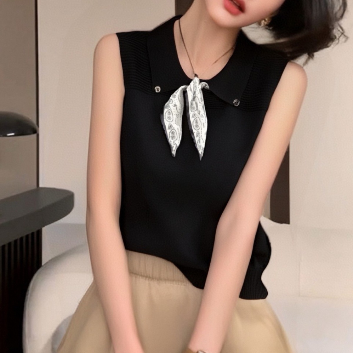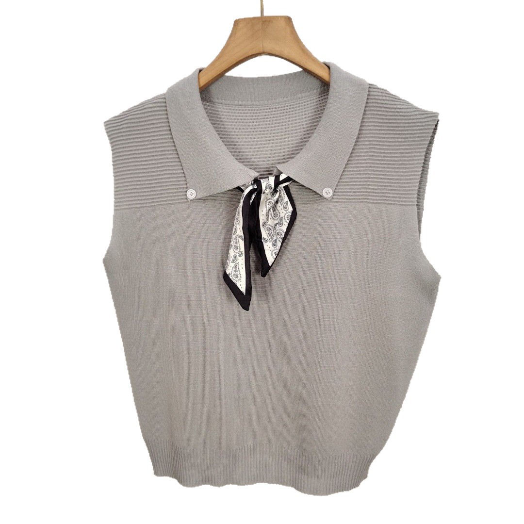 时尚百搭Polo领配丝巾针织背心T恤女夏薄款独特漂亮小衫无袖上衣