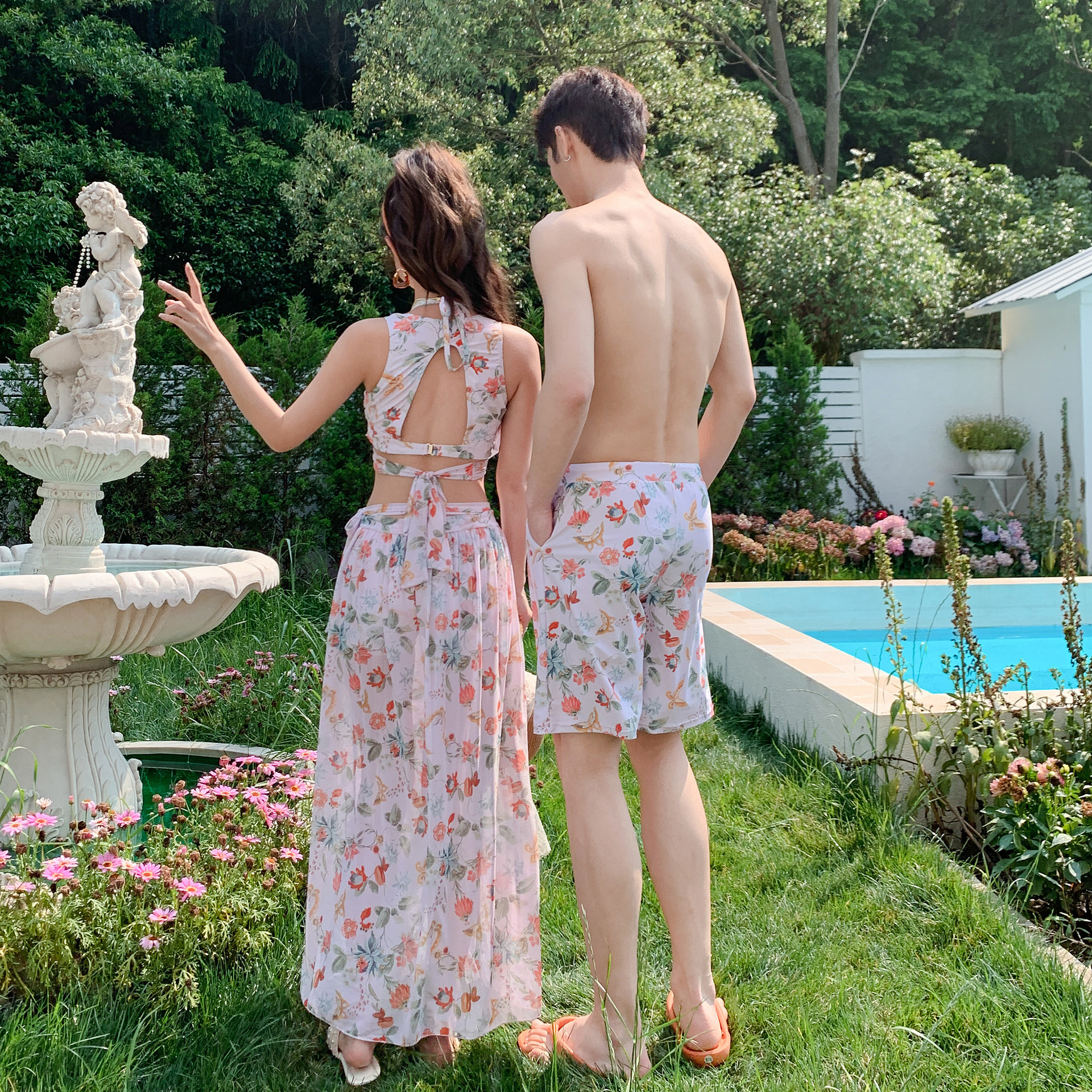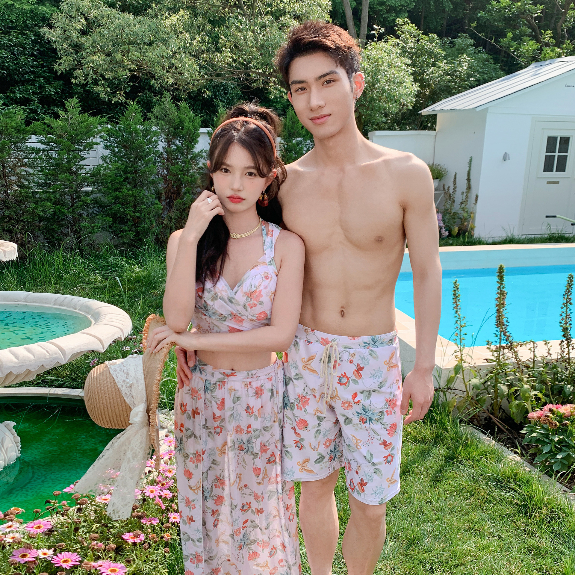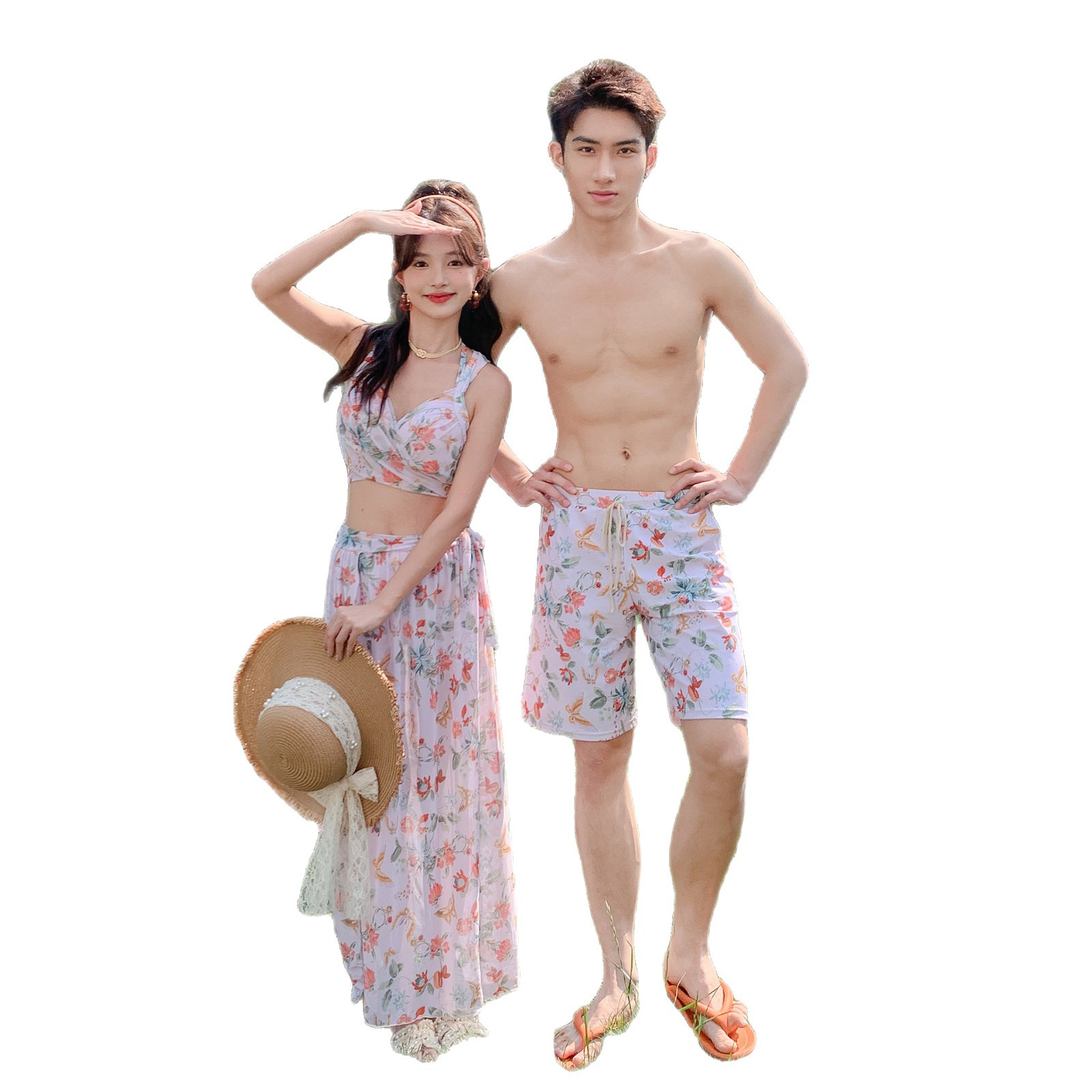 新款情侣高级感比基尼三件套分体泳装女显瘦长裙舒适沙滩裤泳裤男