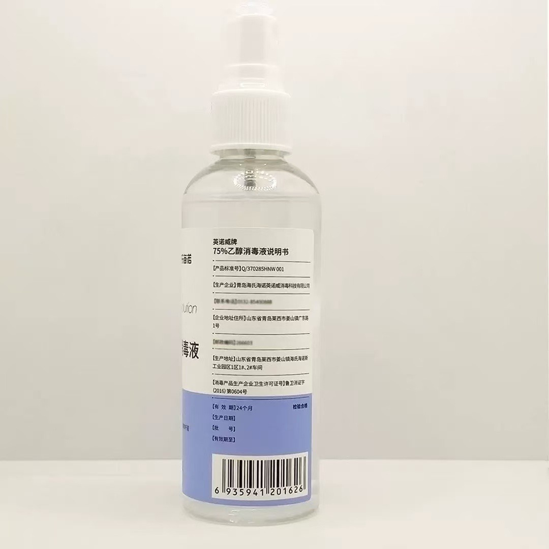 | 卫生许可证号 | 鲁卫消证字(2016)第0604号 | 颜色分类 | 海氏海诺英诺威75乙醇消毒液酒精(圆瓶喷雾)—1瓶 |