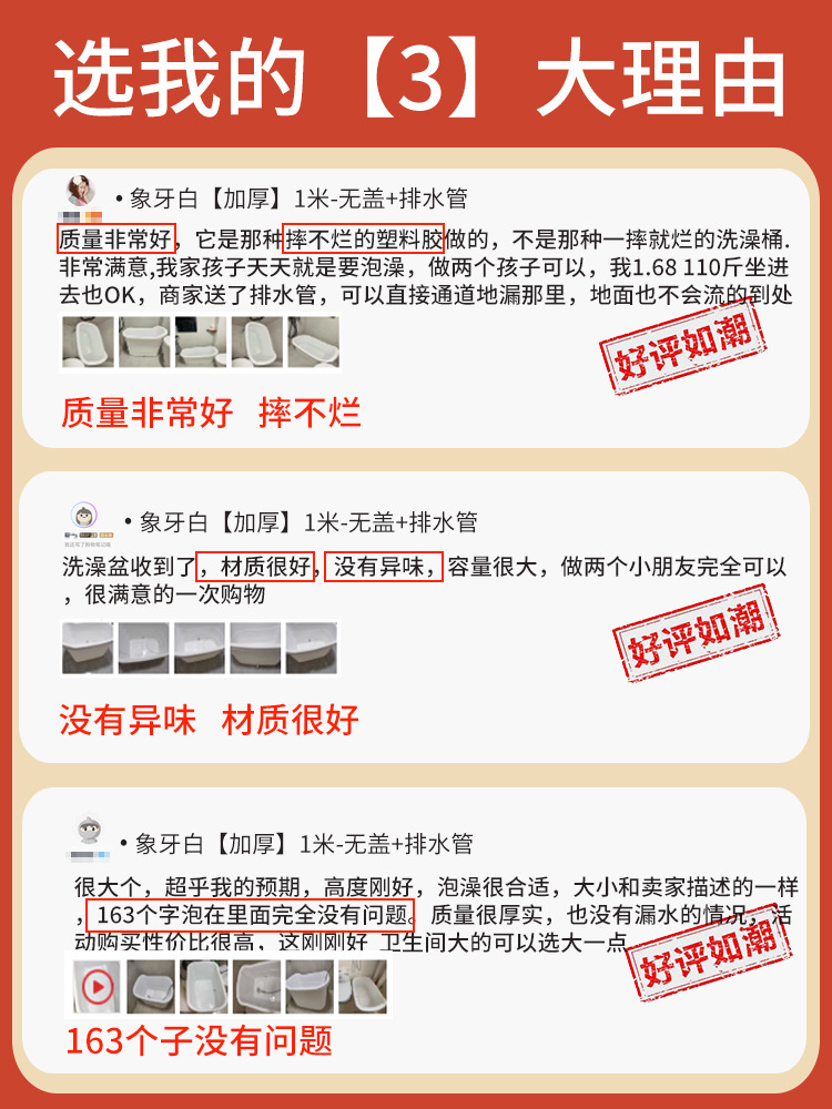 颜色 | 象牙白【变态厚】1米-无盖+浴袋10片+水勺 | | 颜色 | 奶油米【变态厚】1米+浴袋10片+水勺-无盖 |