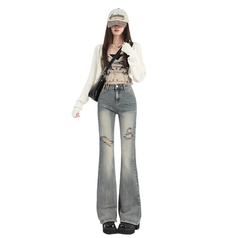 复古破洞微喇牛仔裤女2025年新款秋季辣妹高腰修身秋季潮喇叭裤子