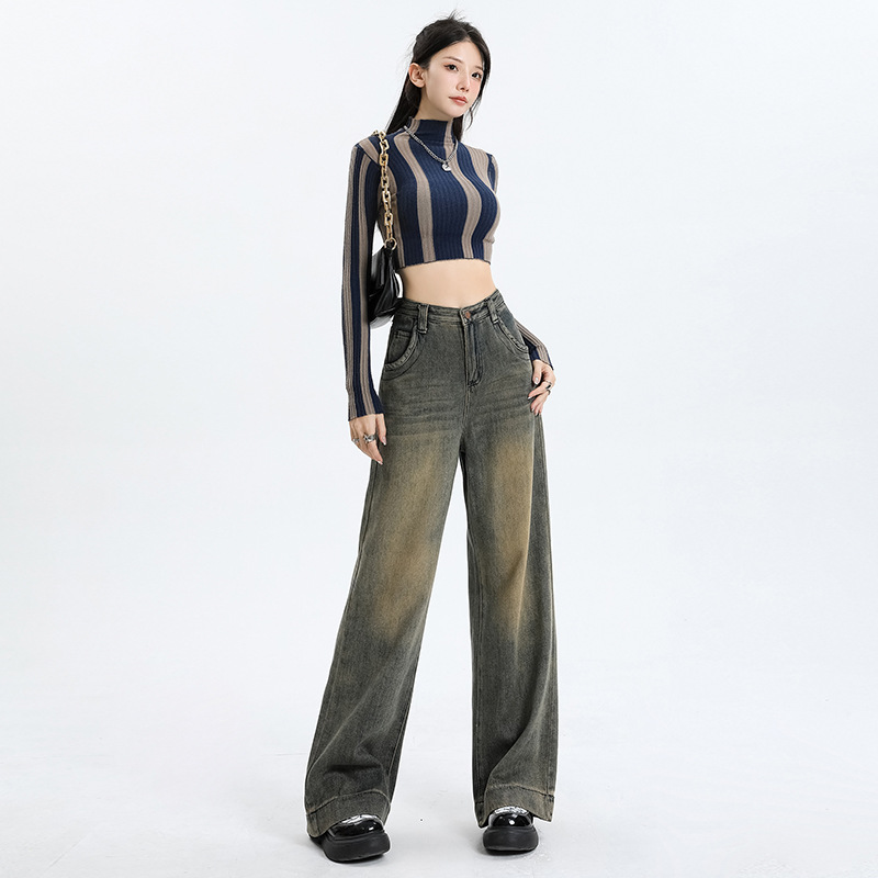 2025春秋款欧美高街牛仔裤女个性时尚复古做旧慵懒风阔腿拖地裤