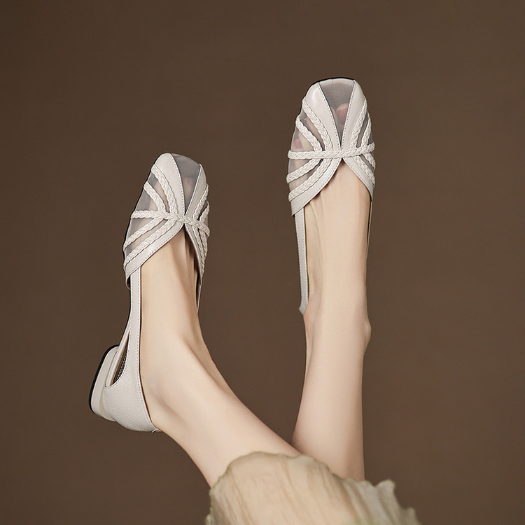 小众设计~网纱镂空拼接真皮包头凉鞋女方头夏季侧空单鞋罗马凉鞋