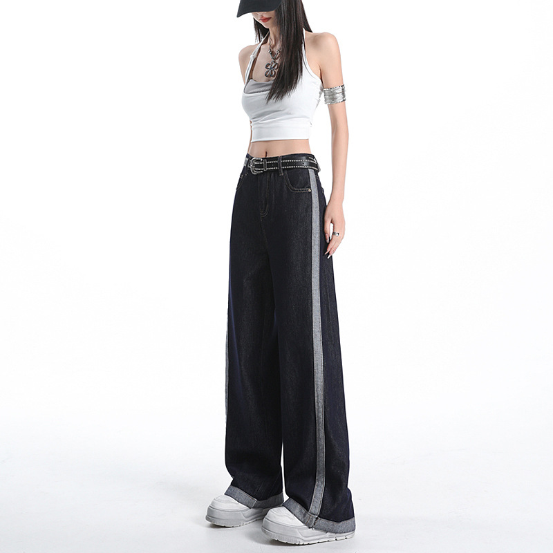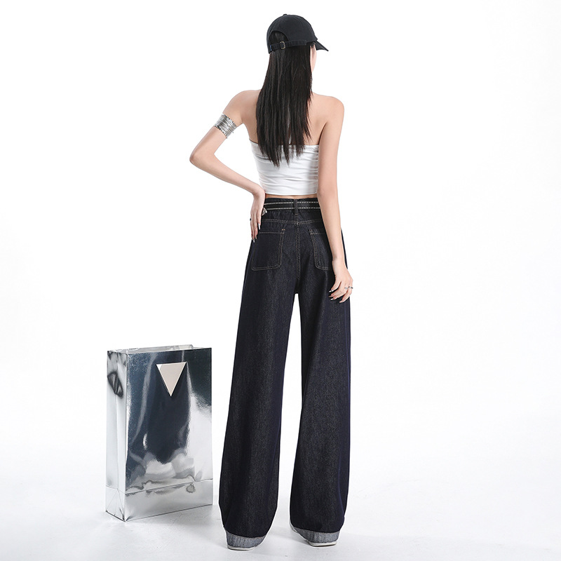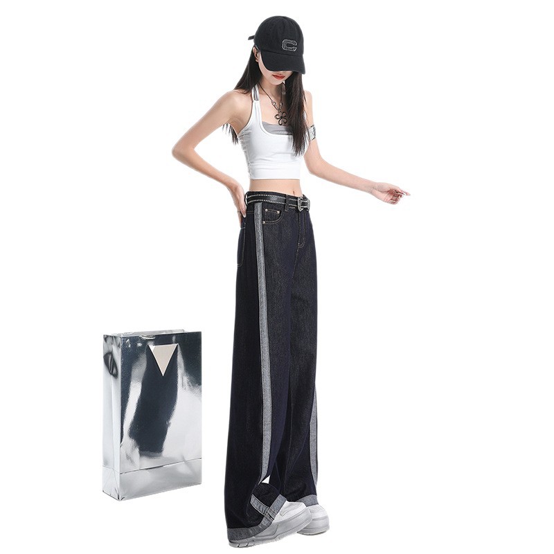 高质感丹宁拼接高腰阔腿牛仔裤女2025春秋宽松显瘦拖地裤潮