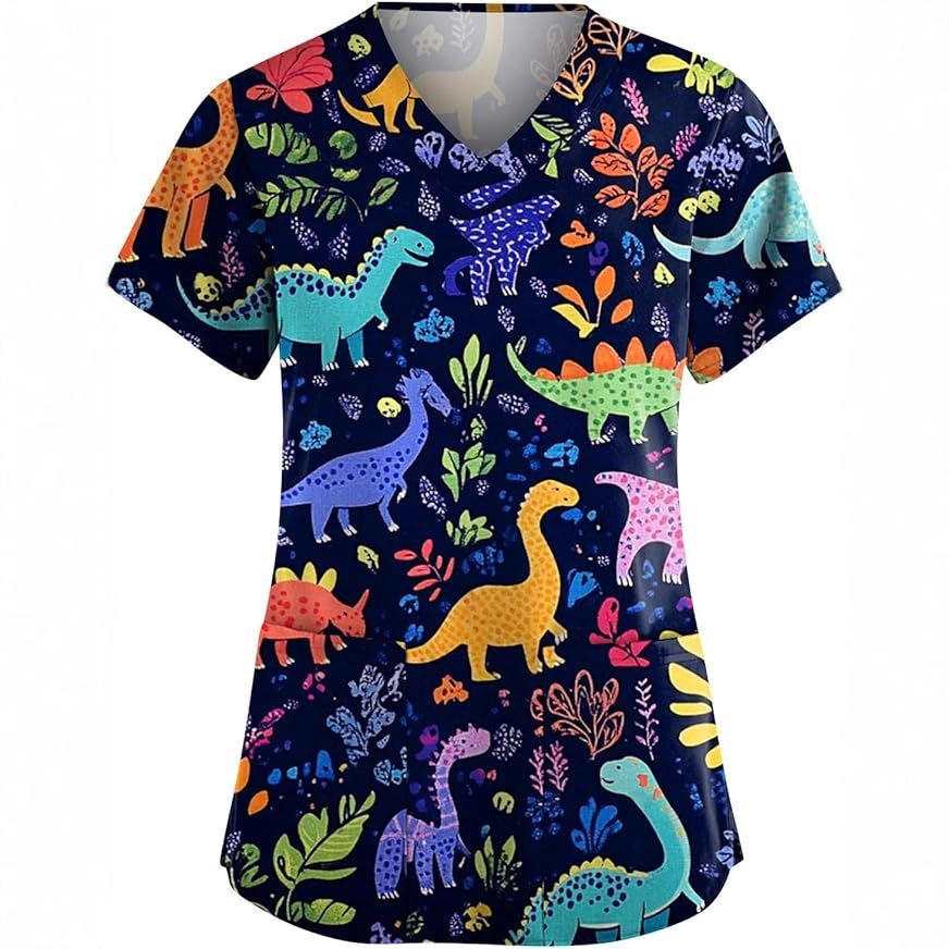 女士恐龙狗猫羊驼动物印花上衣短袖卡通图案V领T恤护士服