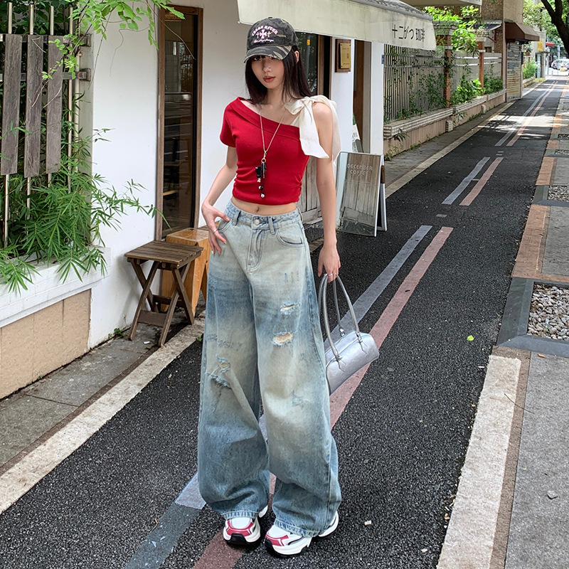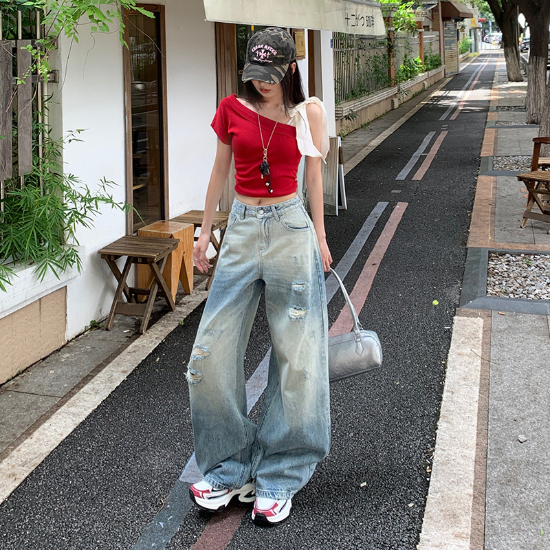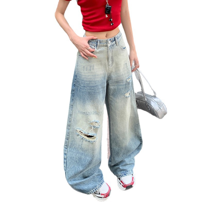 美式复古重工中性阔腿拖地裤2025夏季新款破洞直筒牛仔裤女子女潮