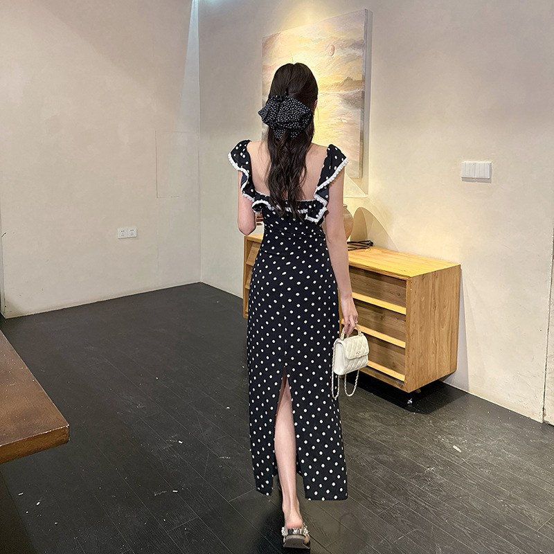 爱依轩 法式方领荷叶边波点连衣裙女夏季甜美小飞袖气质收腰长裙