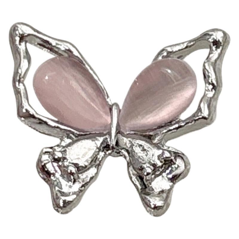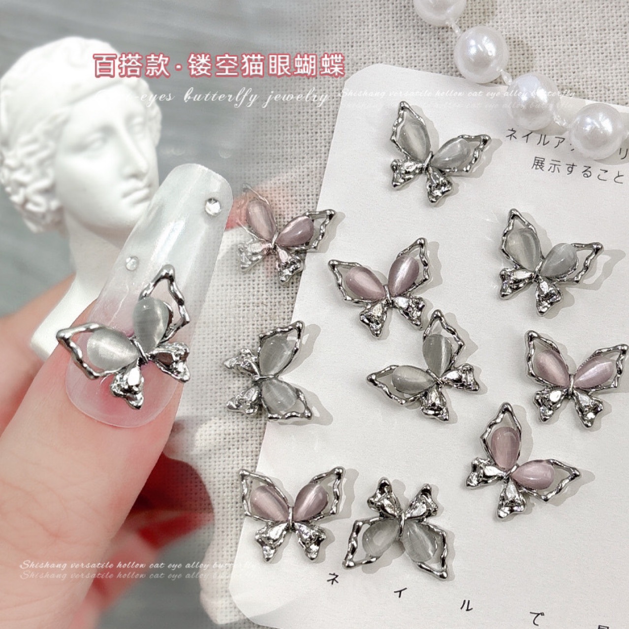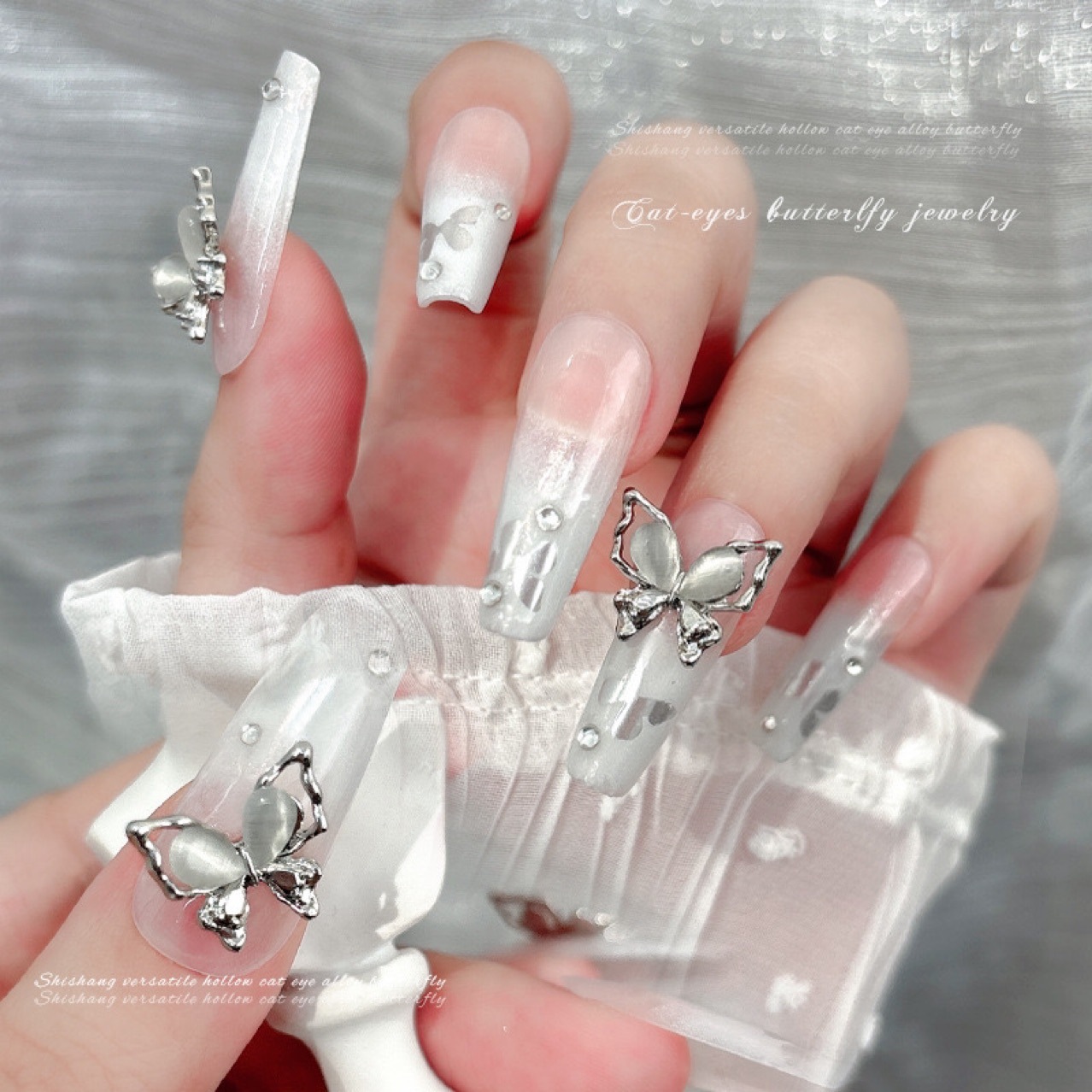 猫眼蝴蝶合金美甲饰品立体镂空银色钻石猫眼石网红穿戴甲片成品钻