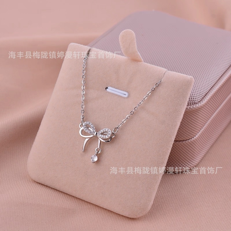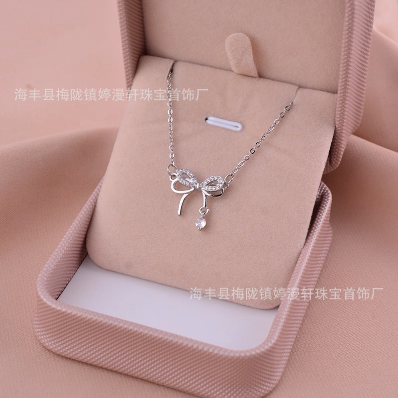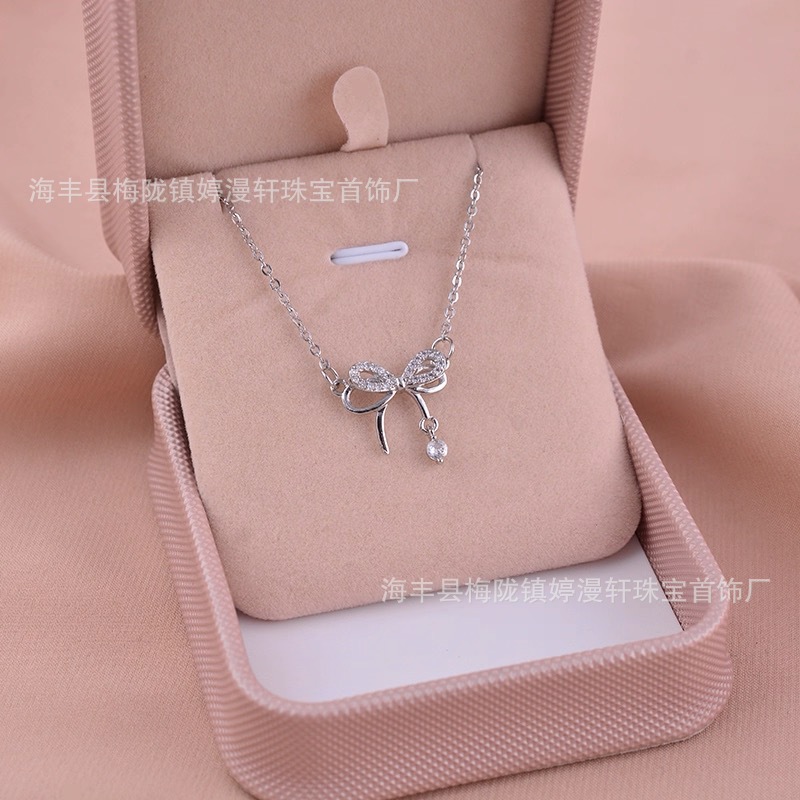 新品S925纯银日韩风感蝴蝶结项链吊坠少女心小清新镶钻锁骨链礼物