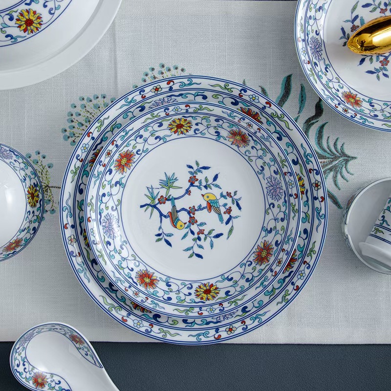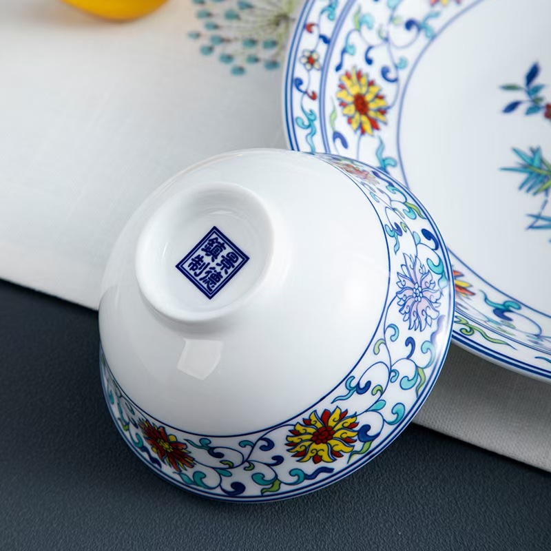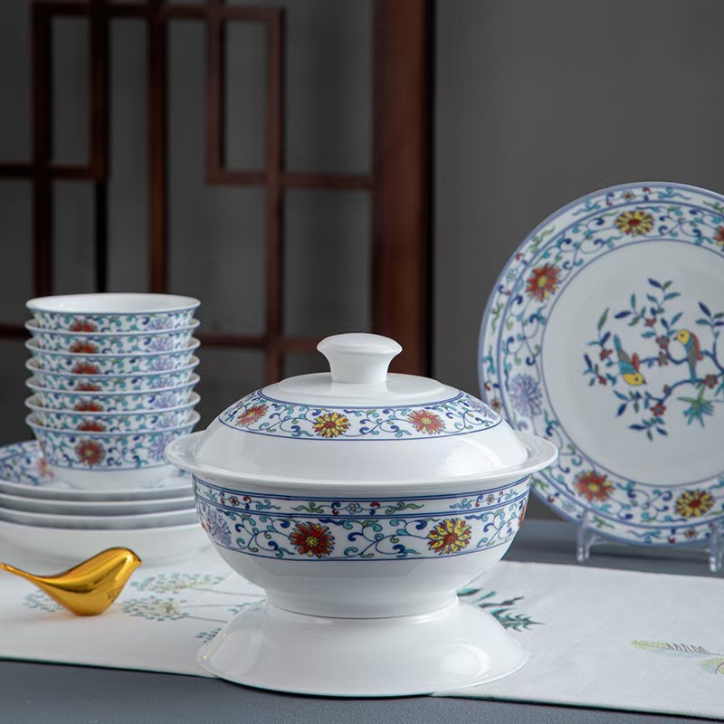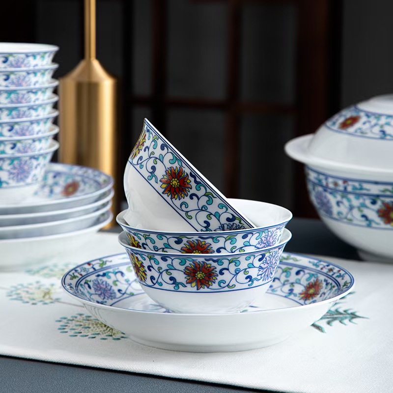 景德镇高温白瓷餐具套装青花斗彩缠枝莲碗盘勺组合乔迁开业送礼物