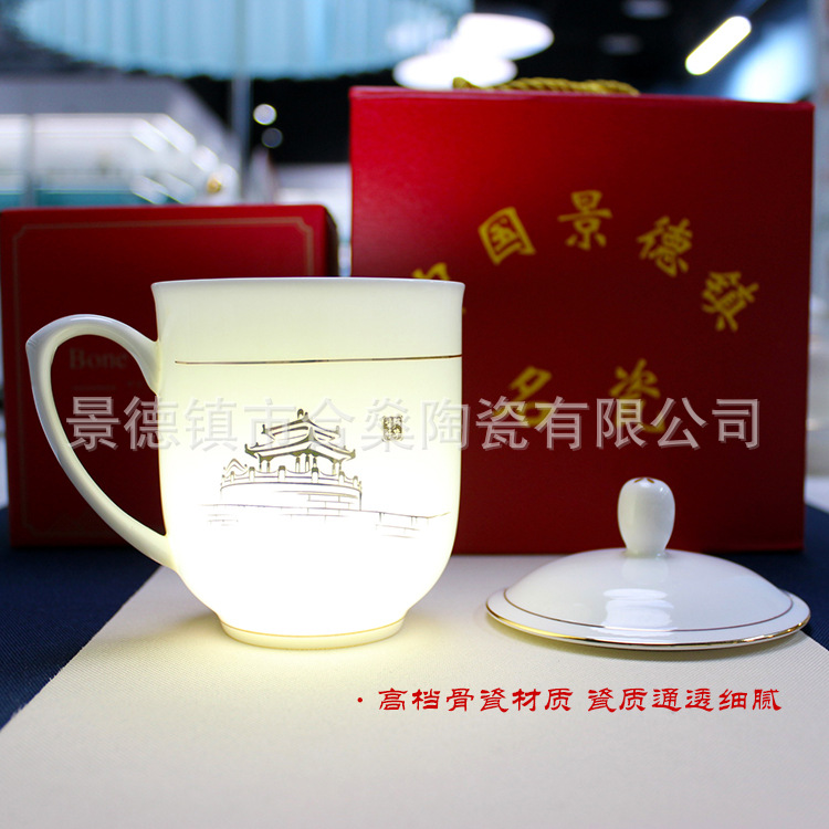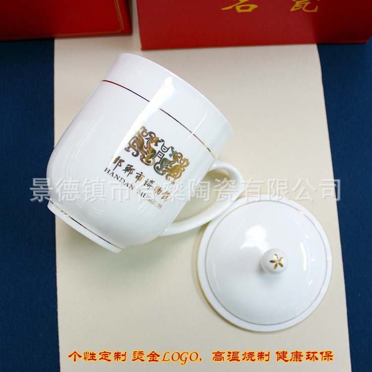 河北邯郸博物馆定制描金中华杯烫金logo 央企职工人员专属办公会议杯带盖