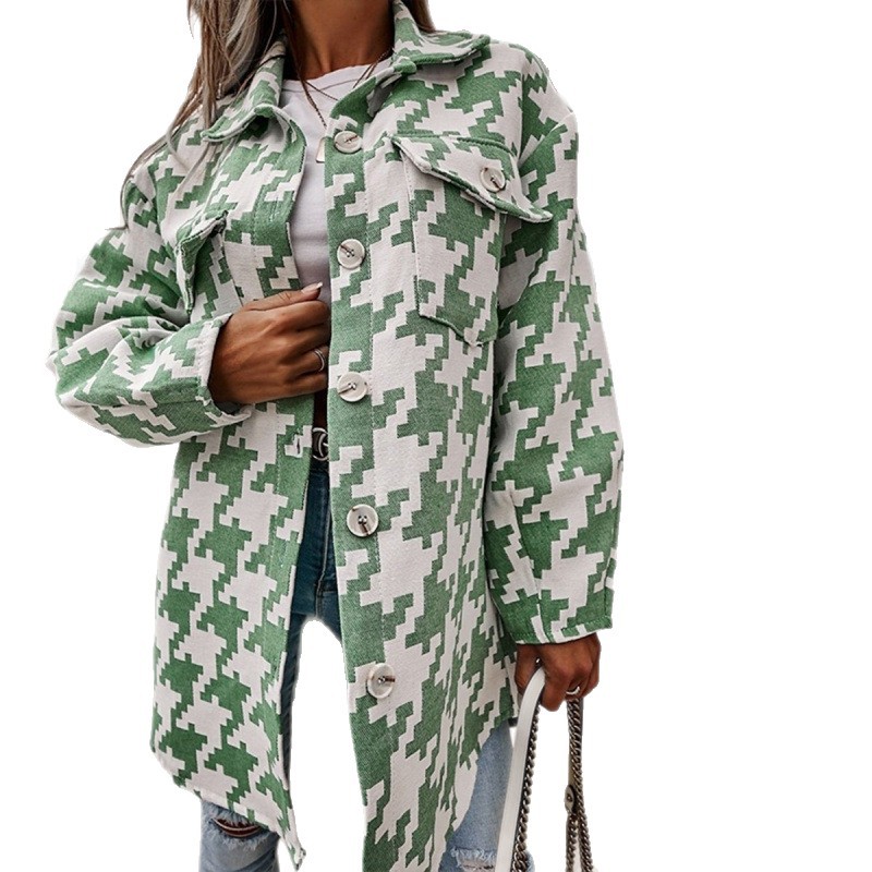 亚马逊独立站跨境外贸女装时尚宽松长袖千鸟格毛呢外套上衣