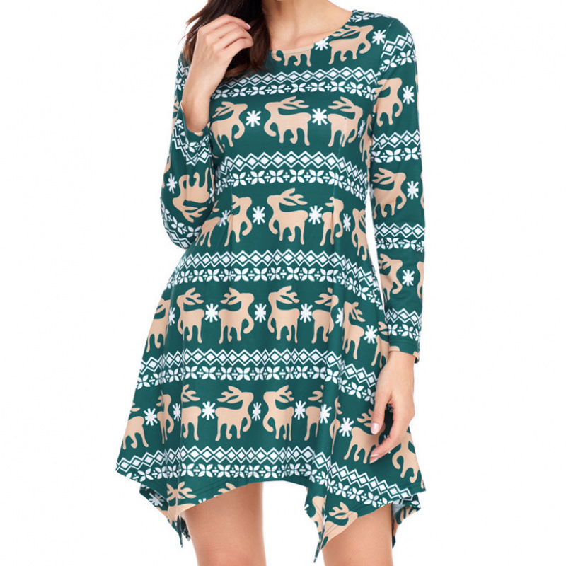 亚马逊独立站跨境外贸女装圣诞小鹿圆领长袖套头不规则下摆连衣裙