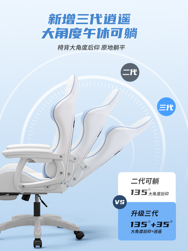 颜色 | 【三代旗舰款】玉桂蓝 | 三级防爆气杆 | 无搁脚+超纤皮 | 头等舱坐感乳胶坐垫 | | 颜色 | 【三代旗舰款】暴雪白 | 三级防爆气杆 | 无搁脚+超纤皮 | 头等舱坐感乳胶坐垫 |