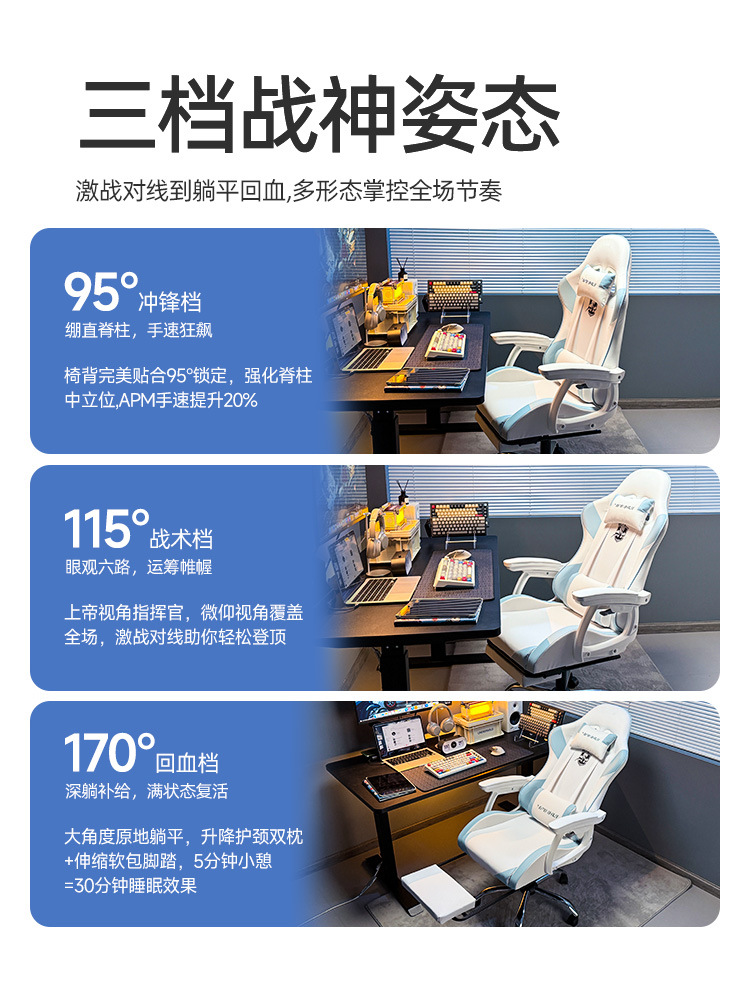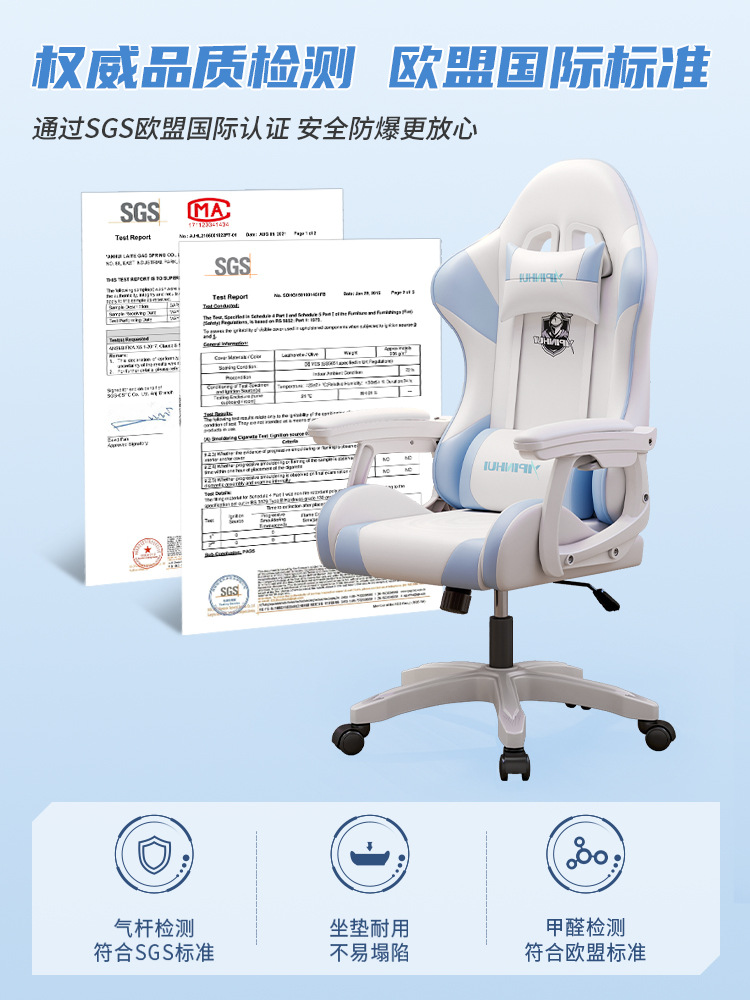 颜色 | 【二代升级款】玉桂蓝 | 三级防爆气杆 | 带搁脚 | 超纤皮 | 赛车舱坐感乳胶坐垫 | | 颜色 | 【二代升级款】暴雪白 | 三级防爆气杆 | 带搁脚 | 超纤皮 | 赛车舱坐感乳胶坐垫 |