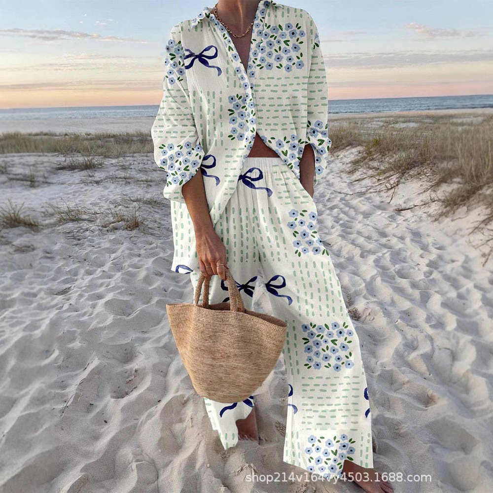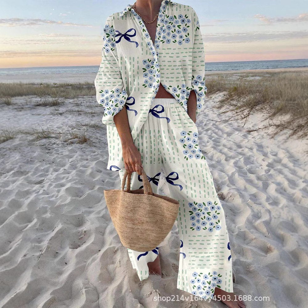 欧美新款 蝴蝶结 休闲衬衫套装宽松运动阔腿裤图画元素休闲套装