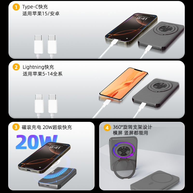 新款磁吸款无线充电宝适用苹果安卓360旋转支架支点跨境电源