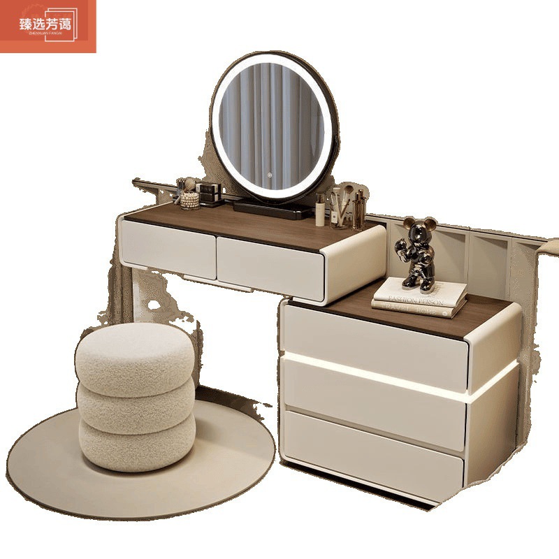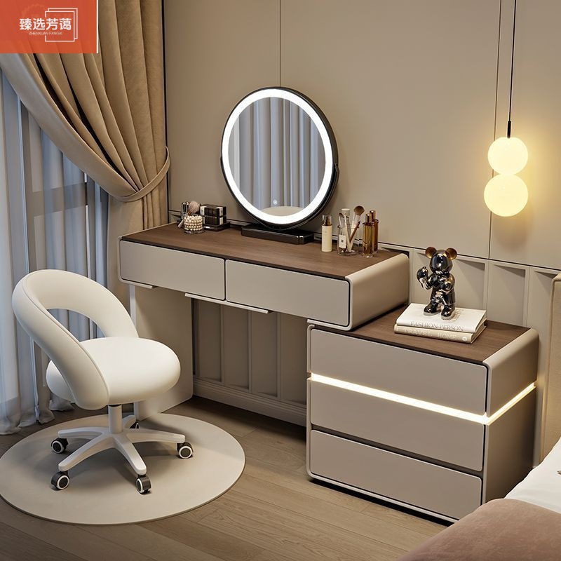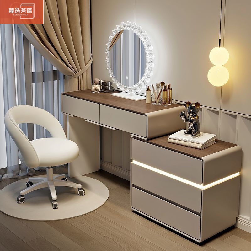 甄选实木踢脚线梳妆台现代简约奶油风小户型化妆桌卧室床头一体