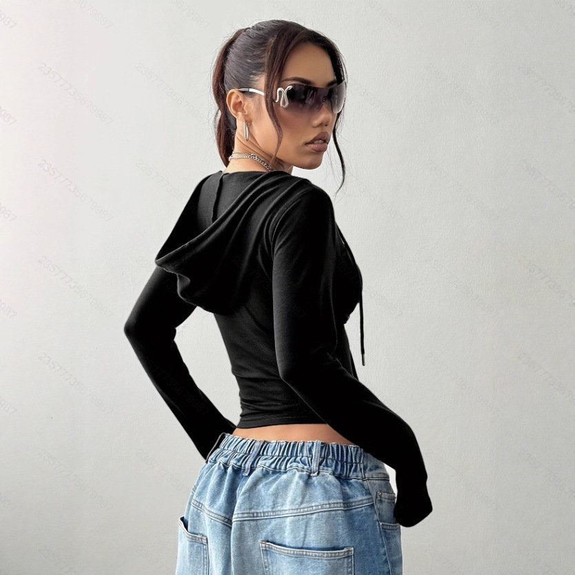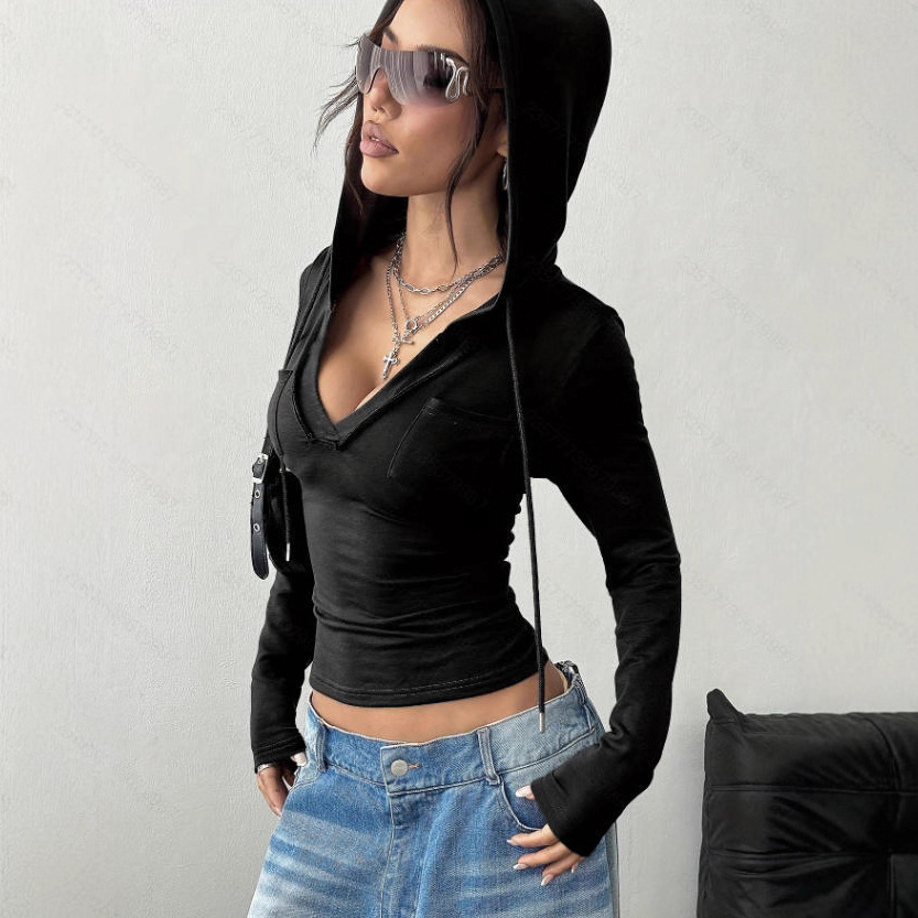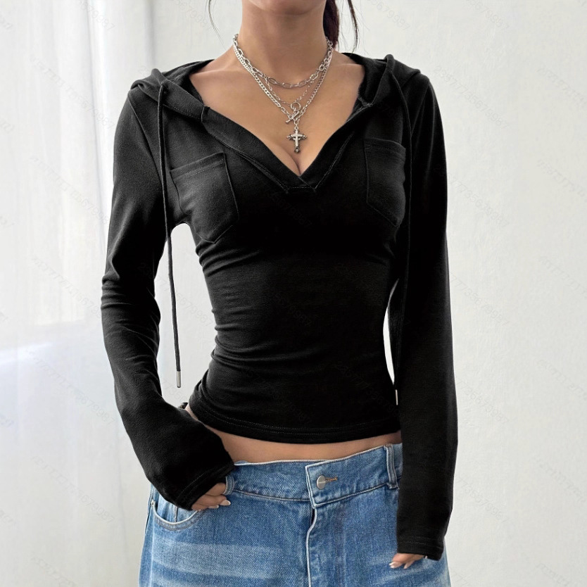 跨境外贸tiktok欧美女士纯色长袖 V领连帽卫衣 休闲百搭款