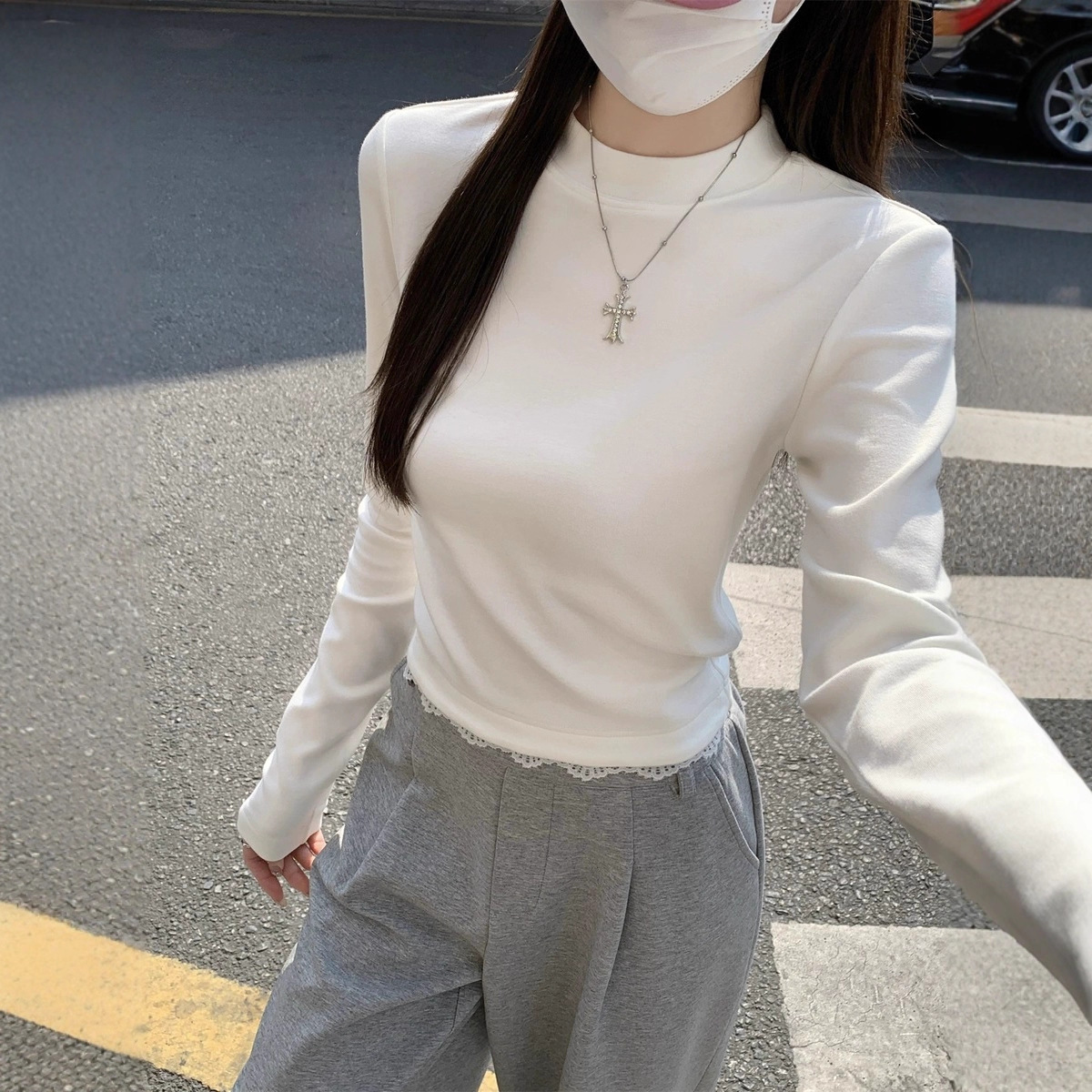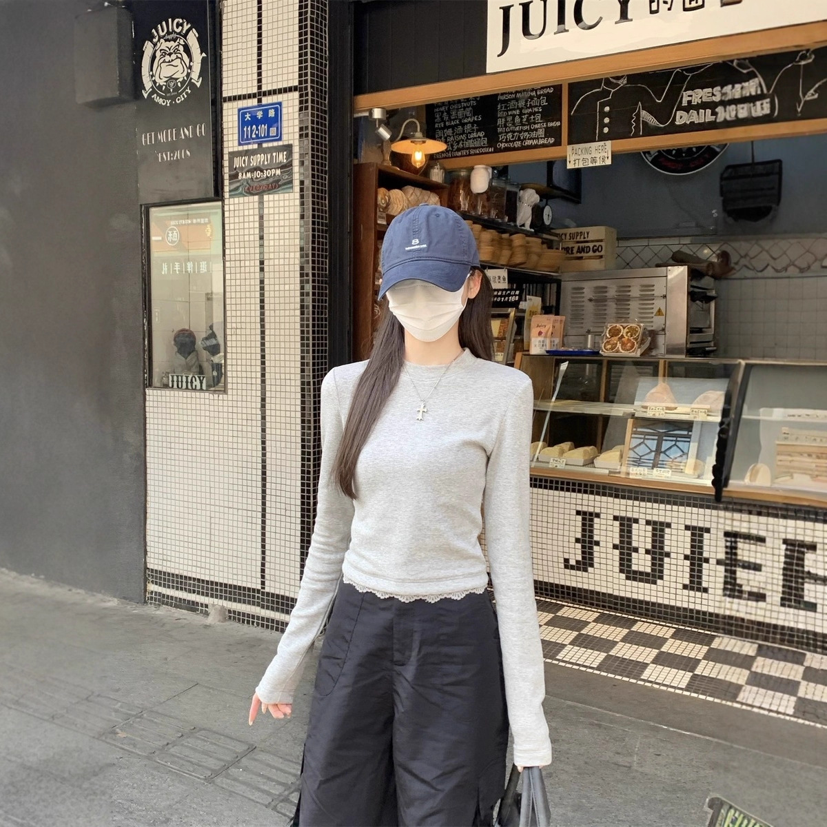 韩系少女穿搭必备!秋季新款蕾丝拼接长袖T恤女-3189
