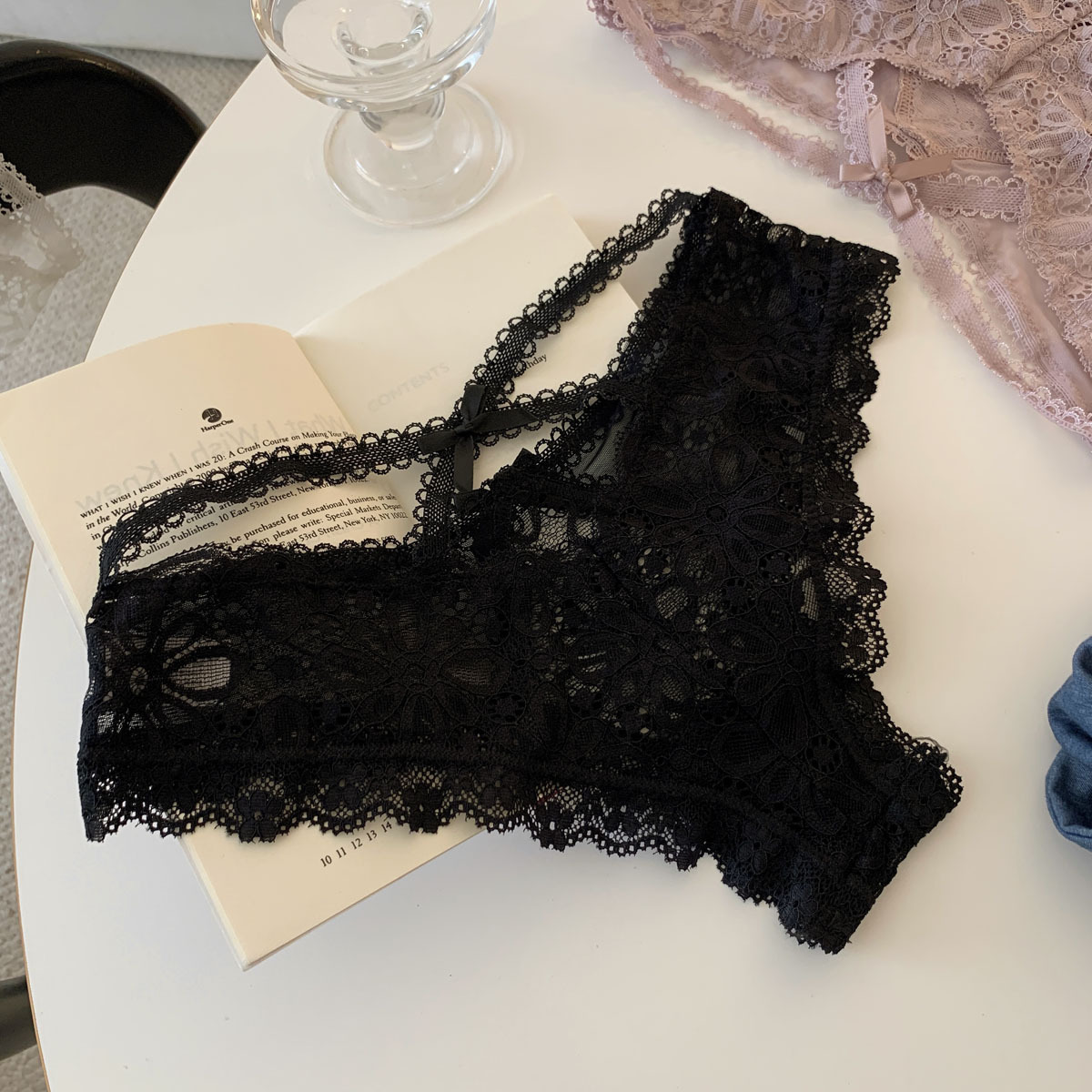 欧美韵紫蕾丝交叉系带半透明女士内裤性感镂空低腰半包臀三角V裤