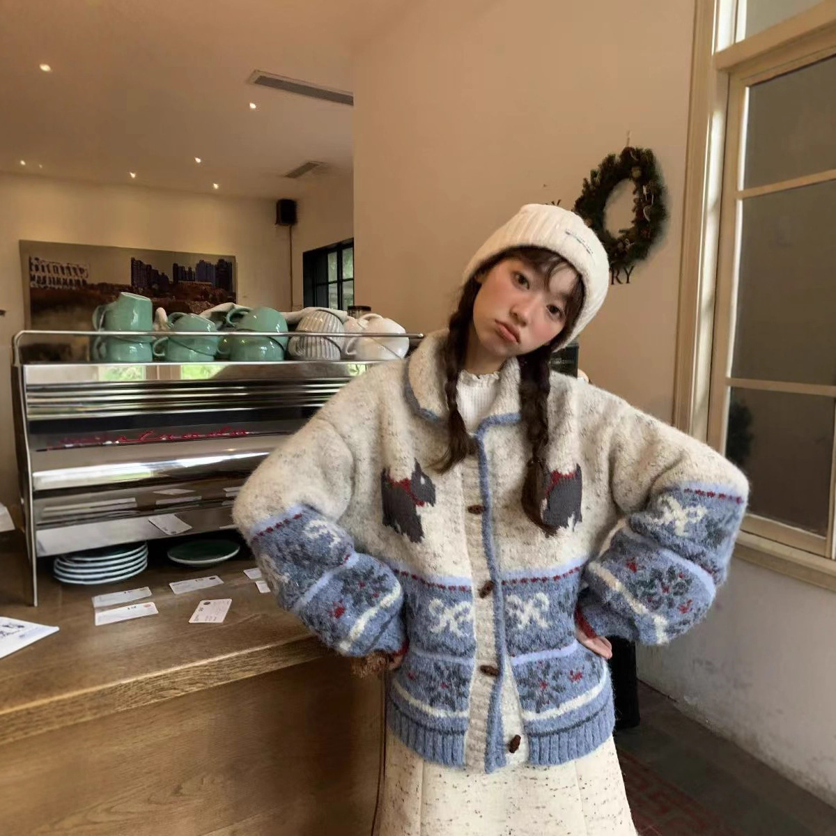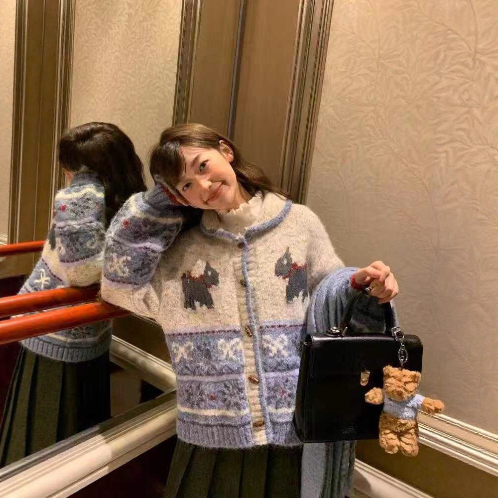 秋冬新款女装卡通小狗牛角扣针织开衫女韩版宽松百搭可爱毛衣外套
