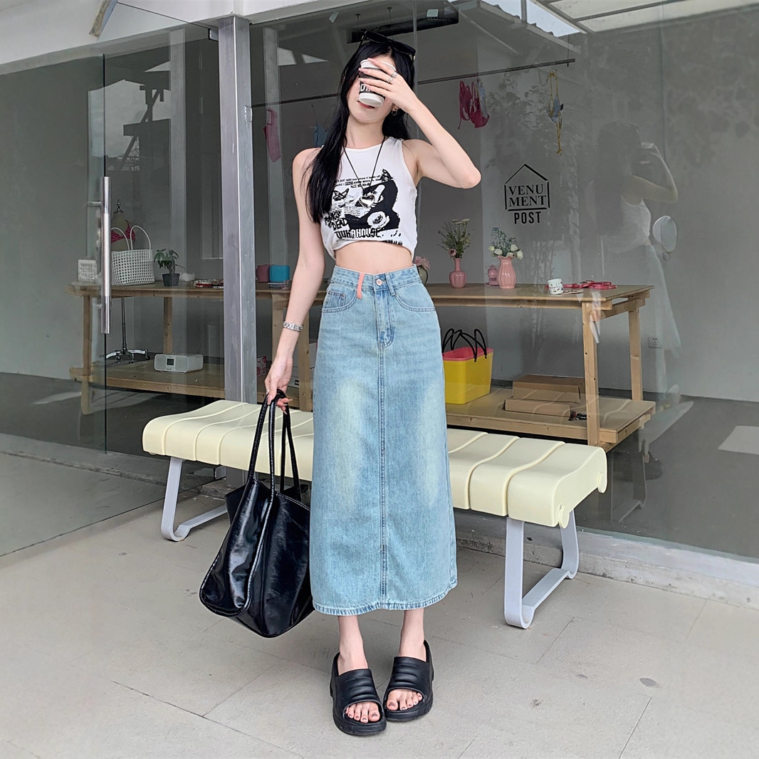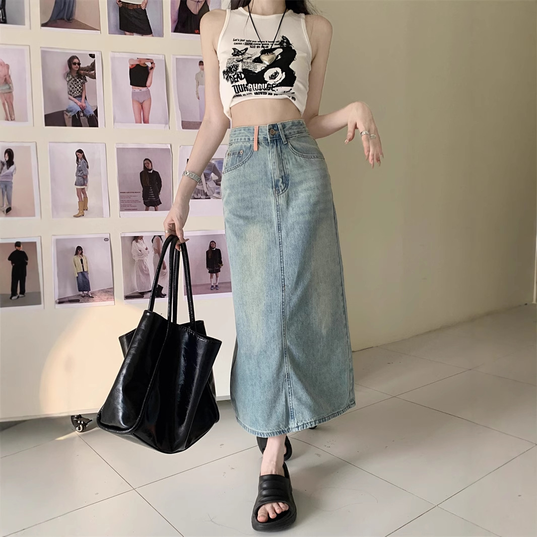 爱依轩 复古口袋刺绣牛仔半身裙新款宽松时尚百搭开叉包臀中长裙