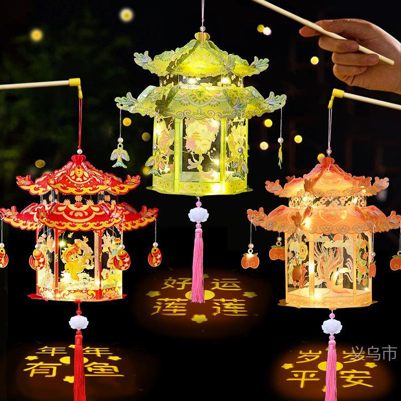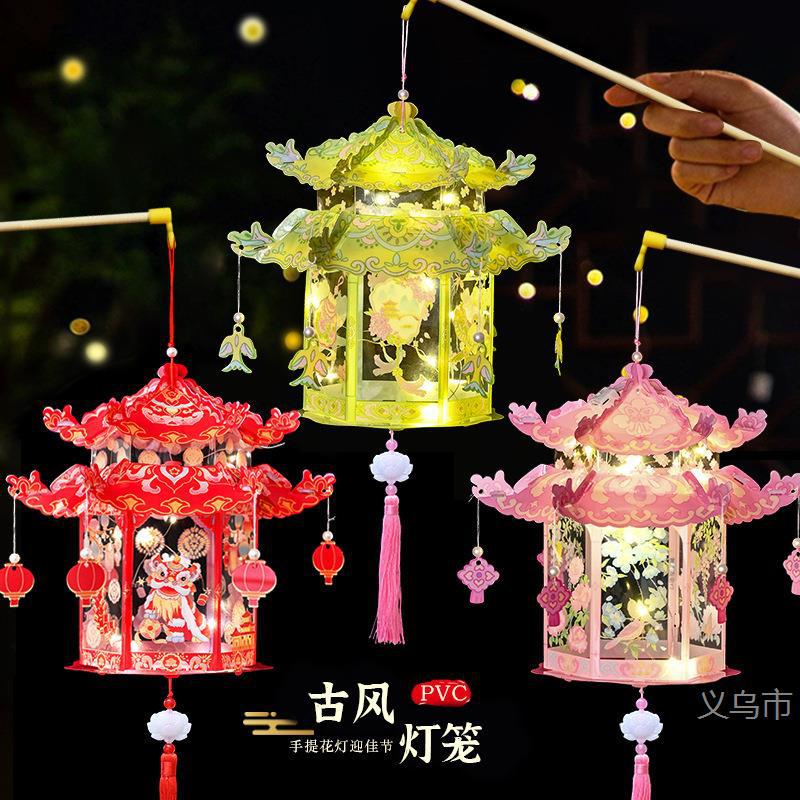 pvc中秋节手提灯笼国潮古风花灯儿童手工diy材料包发光投影小宫灯