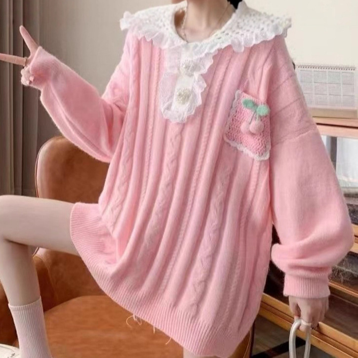 温柔风甜美慵懒风宽松2025秋冬款海军领设计感蕾丝拼接花朵毛衣