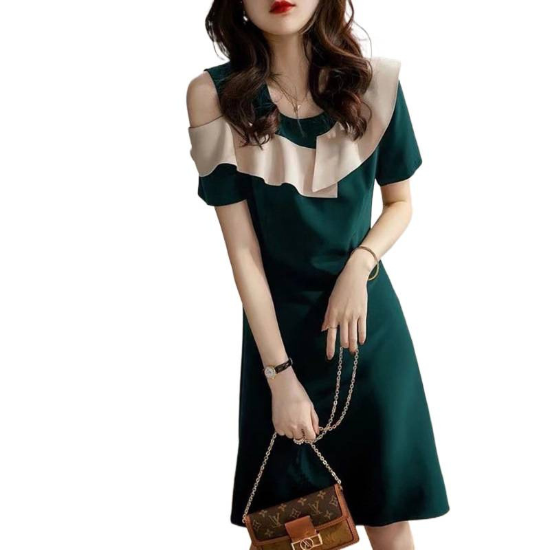 露肩显瘦连衣裙女短袖春季夏装新款优雅气质拼色立体荷叶边小黑裙