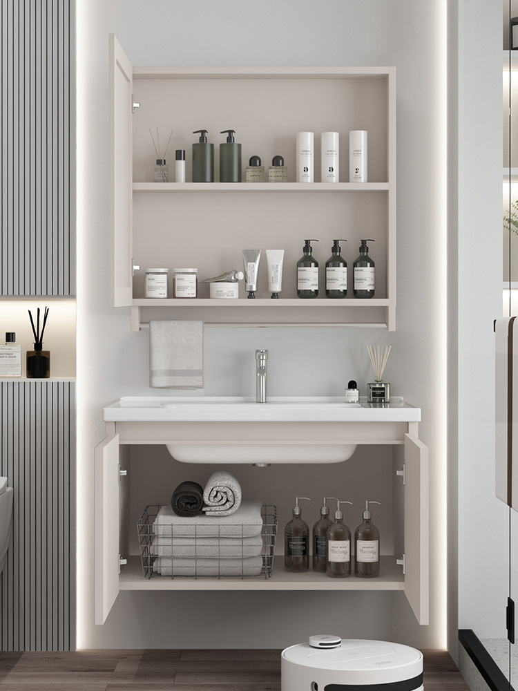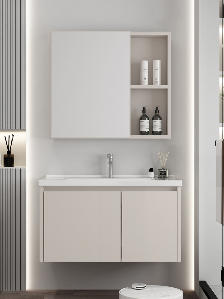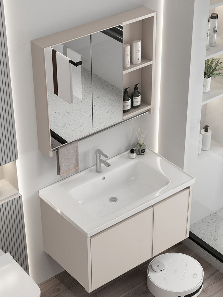 规格 | 奶油风80x48白色岩板盆+毛巾杆 镜柜 | | 规格 | 90x48奶油风全套陶瓷盆 收纳镜柜 |