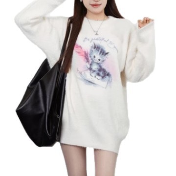 美式潮牌猫咪提花圆领设计2025小众休闲百搭宽松慵懒风情侣毛衣潮