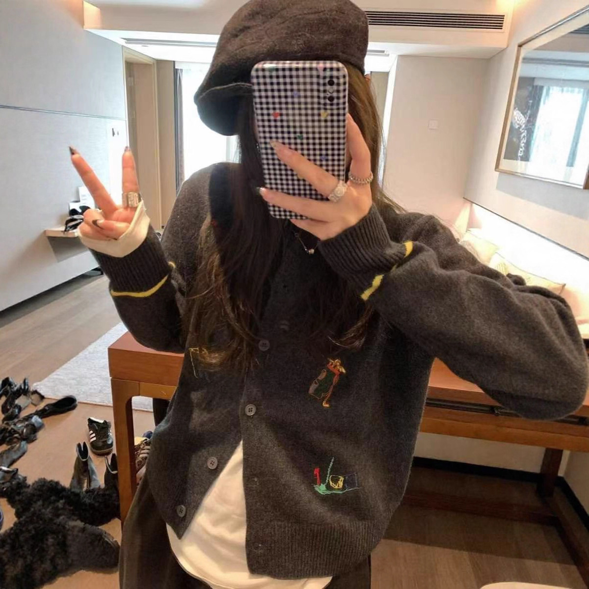 新品2025秋冬季欧货圆领卡通刺绣氛围感慵懒感开衫女毛衣外套针织