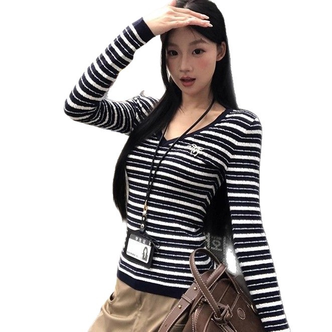 2025条纹轻薄修身长袖T恤性感露肩简约百搭显瘦百搭掐腰休闲上衣